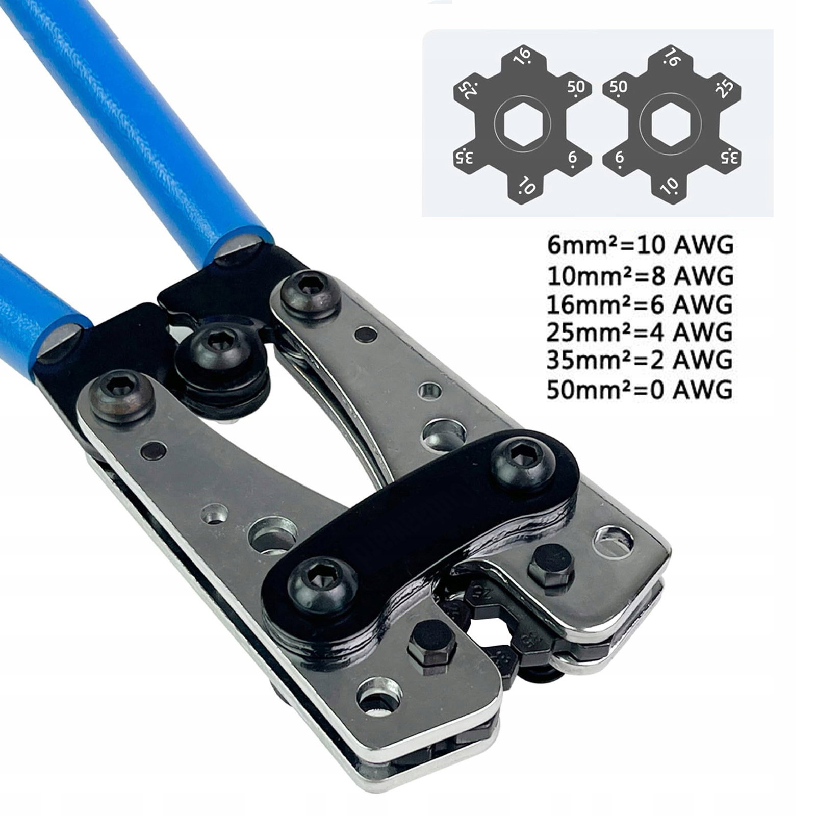 [Obrótowe matryce zaciskane] Zaciskanie Tool is dostępne in 6 rozmiarach zaciskanych, 10, 8, 6, 4, 2, 1, AWG (6mm²/10mm²16mm²/25mm²/35mm²/50mm² )Wykorzystuje obrotową głowicę zaciskaną ze Spring Załadowany trzpień blokujący do zatrzym szczękę.