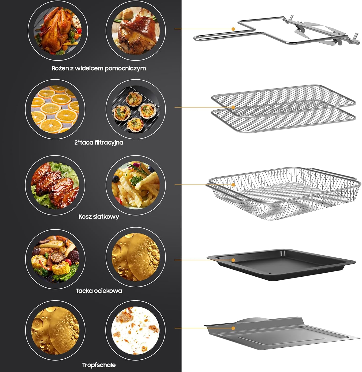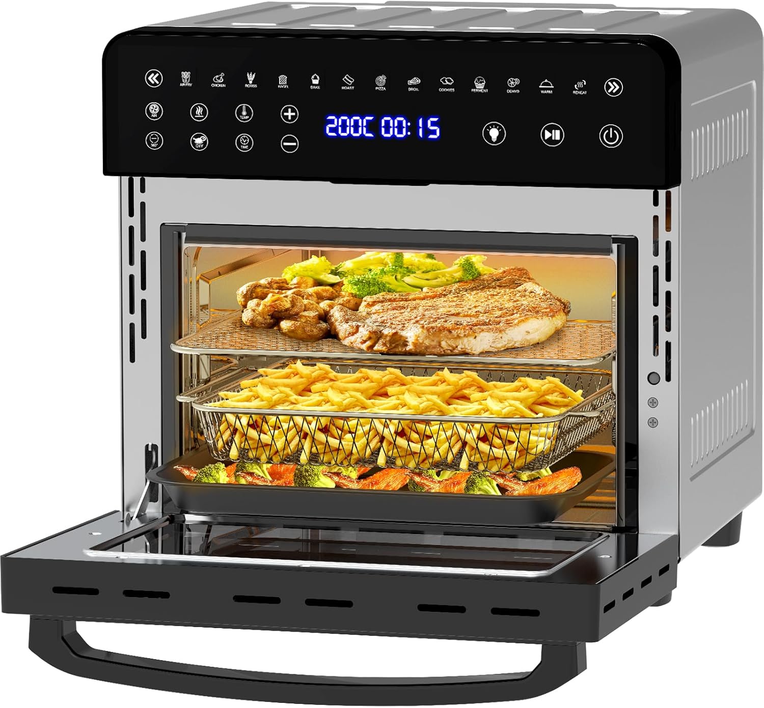 - 13 wielofunkcyjności: automatyczne programy: rożen, pieczenie, smażenie na gorącym powietrzu, pizza, ciasteczka, tosty, podgrzewanie, fermentacja, broil(grillowanie), bajgiel, utrzymywanie ciepła, smażenie, suszenie inspirują Cię podczas gotowania. Przejrzysty wyświetlacz, łatwa obsługa, obsługa ręcznego ustawiania temperatury i czasu, które odpowiadają indywidualnym gustom