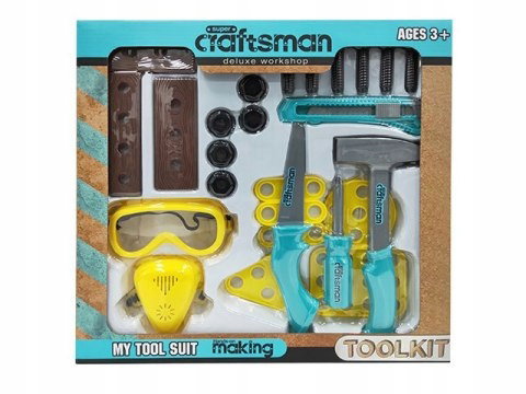 Zestaw narzędziowy, który zawiera: śrubokręt, piłę, nóż do papieru, młoptek, śrubki, okulary, maseczkę, kawałki drewno. Produkt nie potrzebuje baterii. Zabawka przeznaczona dla dzieci powyżej 3 roku życia.