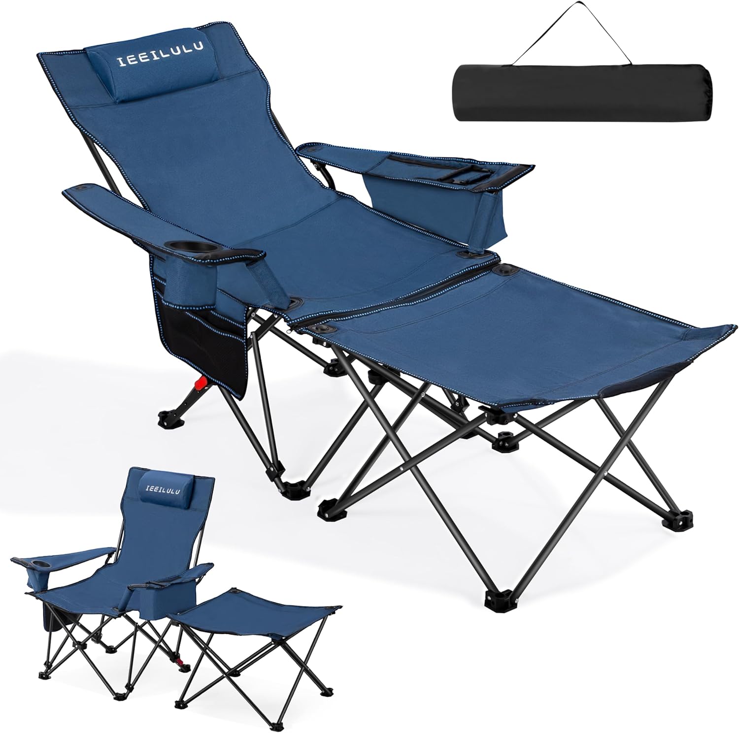 IEEILULU Krzesło Kempingowe, Leżak Składany na Zewnątrz, Krzesło Przeciwsłoneczne z regulowane oparcie, torba na kubek, torba na telefon komórkowy, do aktywności na świeżym . powietrzu (Niebieski)