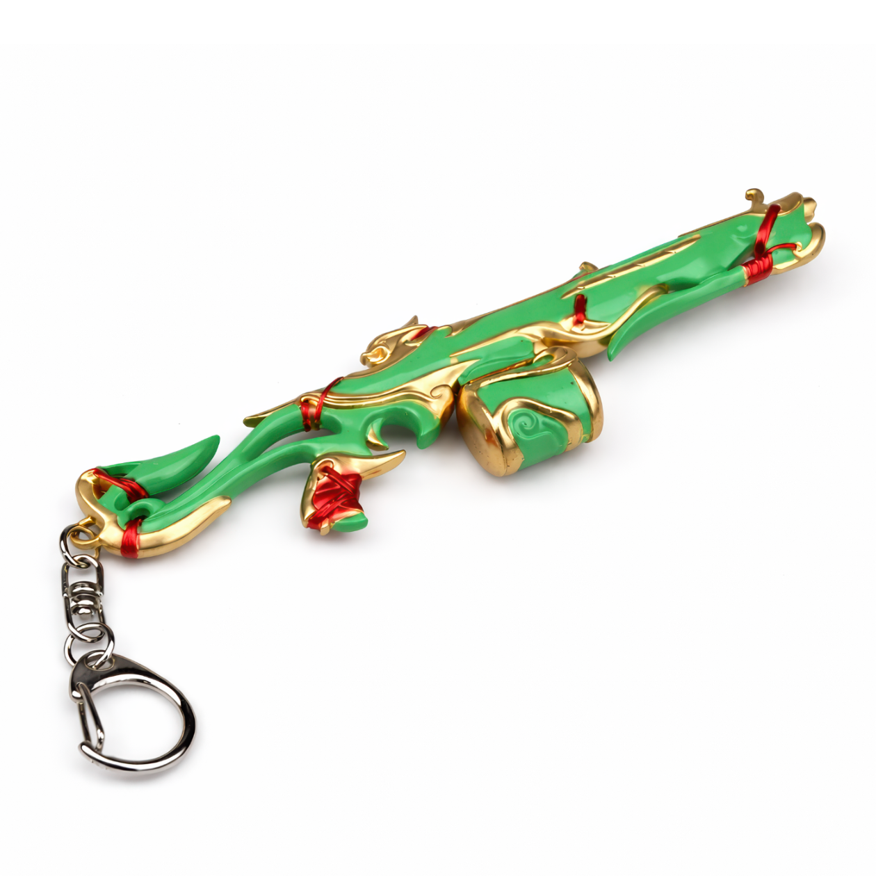 Od pierwszego full-buya po ostatniego clutcha — klimat Valorant to nie tylko gunplay, ale też styl, a Imperium Judge Prime Vandal pozwala mieć go zawsze przy sobie. Ten metalowy brelok o długości 13 cm ma kształt smukłej, ozdobnej sylwetki karabinu i wykończenie w intensywnej, szmaragdowej zieleni z błyszczącym, „emaliowanym” połyskiem. Wypukłe linie i fazowane krawędzie dodają głębi, a złote zdobienia płynnie prowadzą po całej formie jak filigran z topowych skinów. Czerwone „owijki” i rzeźbiony, jubilerski akcent przy chwycie robią mocny kontrast, a masywniejszy detal magazynka domyka ten premium wygląd.
