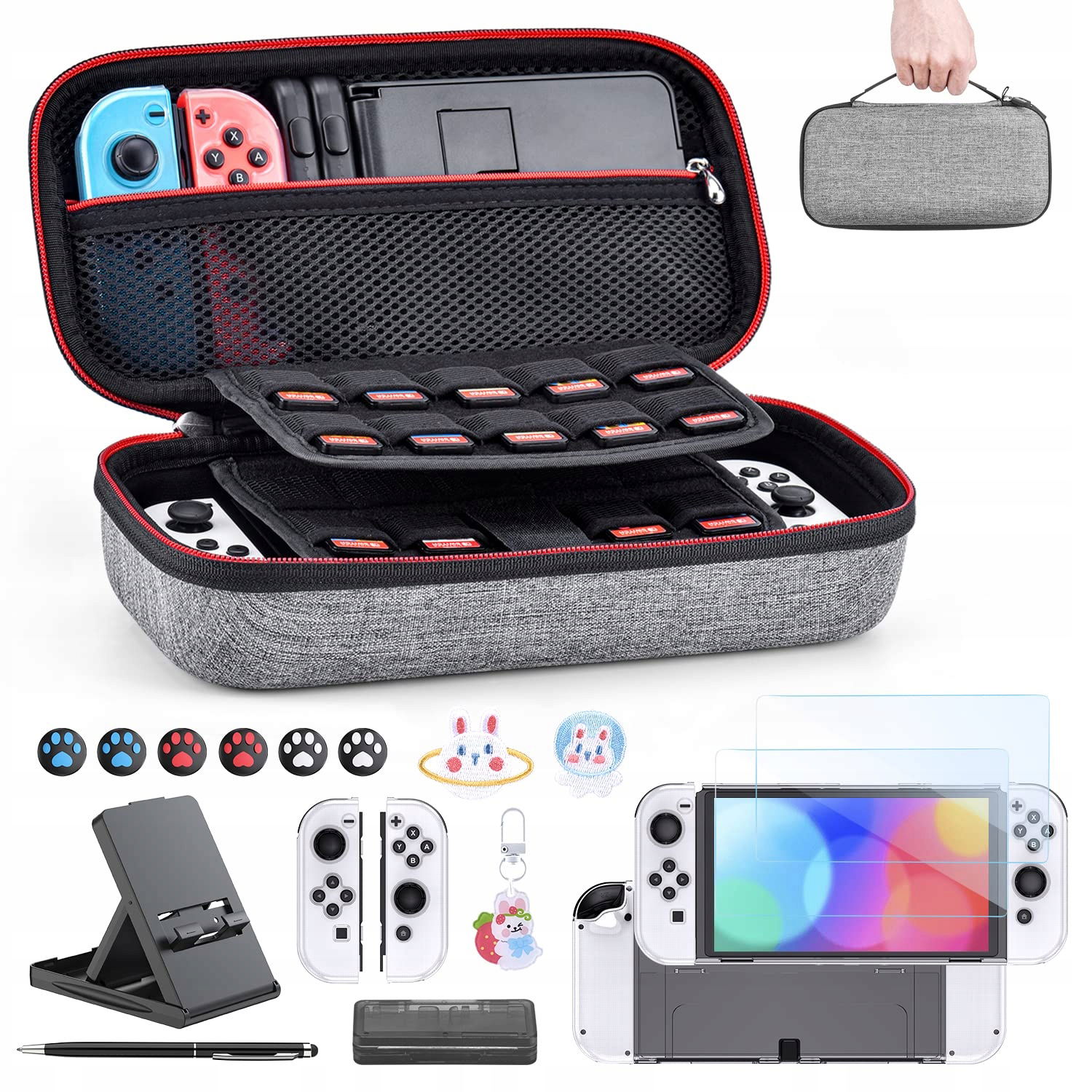 Obudowa przełącznika do przełącznika NS - innoAura 16 w 1 zestaw akcesoriów do przełącznika z futerałem do przenoszenia przełącznika, futerałem do gry Switch, stojakiem na przełącznik, uchwytami na kciuki Switch (szary)