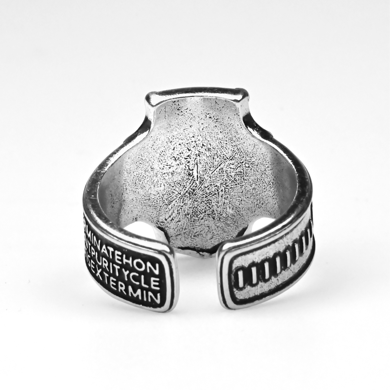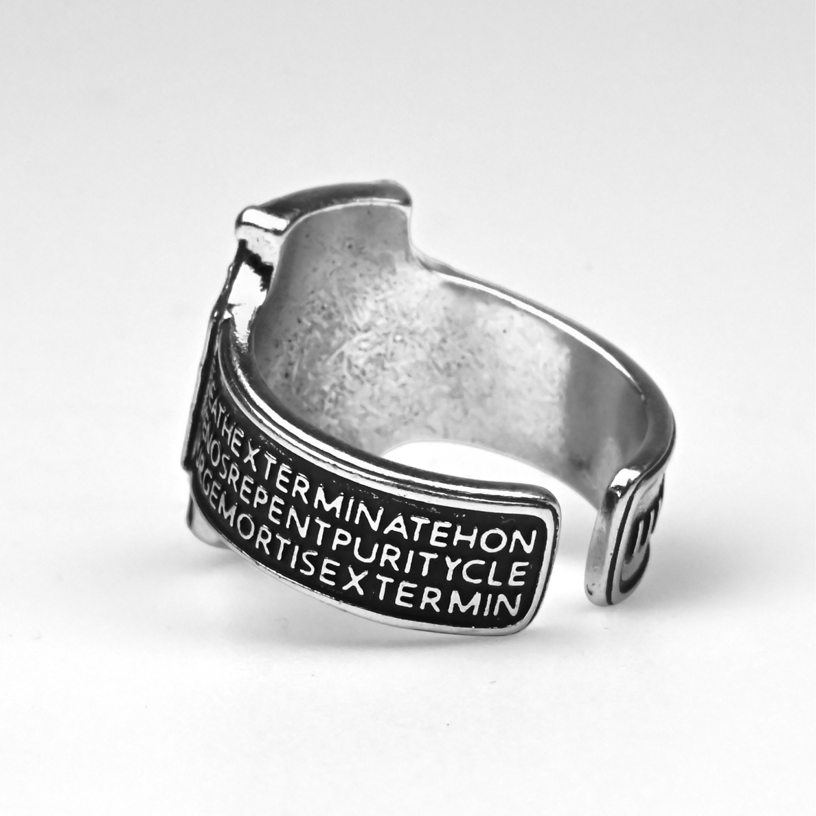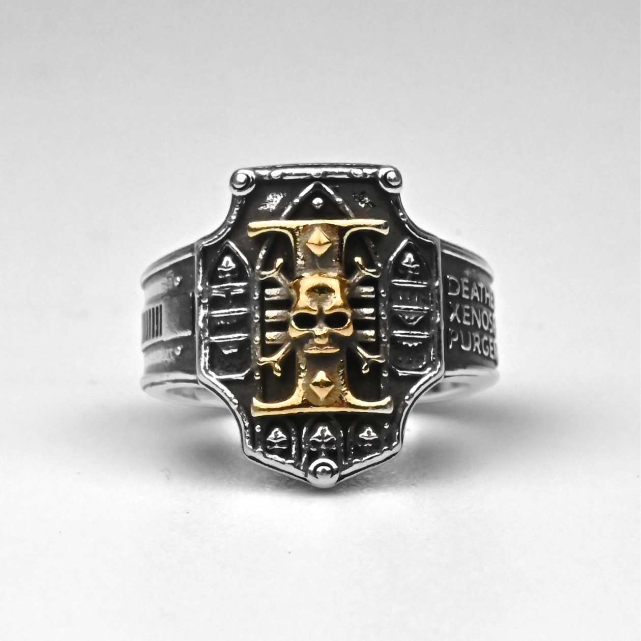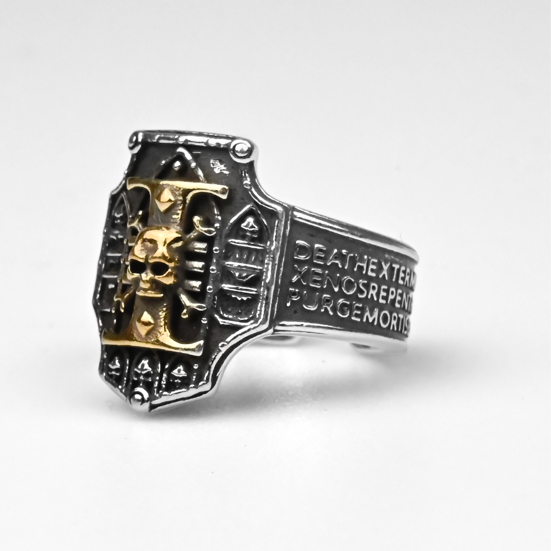 W mroku Warhammer 40k Inkwizycja odpowiada tylko przed własną pieczęcią — a pierścień Inquisition pozwala Ci nosić tę władzę jak cichy wyrok. To propozycja dla hobbystów, kolekcjonerów i cosplayerów: od razu daje klimat, budzi fanowską dumę i świetnie wygląda zarówno na półce, jak i na dłoni na co dzień. Ten Metalowy Pierścień o regulowanym rozmiarze ma tarczową „twarz” z głębokimi, przyciemnionymi zagłębieniami i ostrym, wypukłym reliefem. W centrum dominuje złocisty symbol „I” z rzeźbioną czaszką, a nad i pod nią widać małe, romboidalne „nity”; do tego narożne detale jak łby śrub i warstwowe panele, które kojarzą się z uświęconym wojennym sprzętem. Wypolerowane krawędzie łapią światło, a ciemne rowki podbijają czytelność znaku — idealnie na sesję z kostkami, do malowania figurek albo szybkiego zdjęcia armii. Sama obrączka jest masywna, fazowana, a na jednym boku ma gęsty napis w ciemnym polu, gdzie wyraźnie przebijają słowa „DEATH”, „XENOS” i „PURGE”, pasujące do bezwzględnej doktryny Ordos i klasycznej estetyki z kodeksów. Po drugiej stronie jest prosty panel z „paskowym” wzorem, a otwarty tył pozwala w sekundę dopasować rozmiar. Dorzuć ten Inquisition collectible do swojej rotacji albo sprezentuj komuś, kto żyje lore — gotowy na kolejną kampanię.