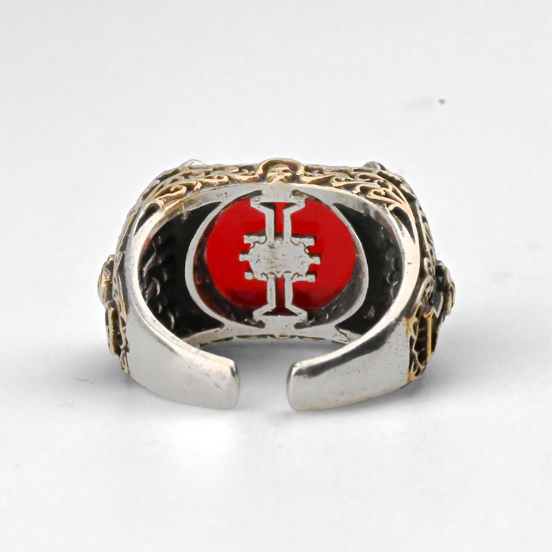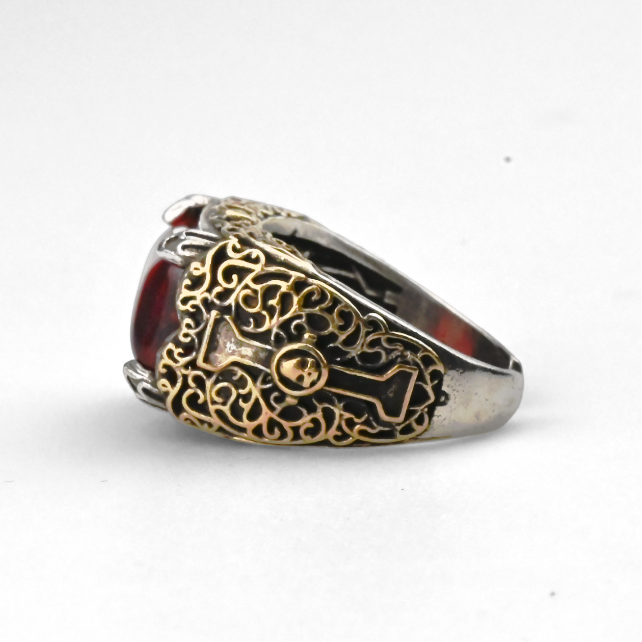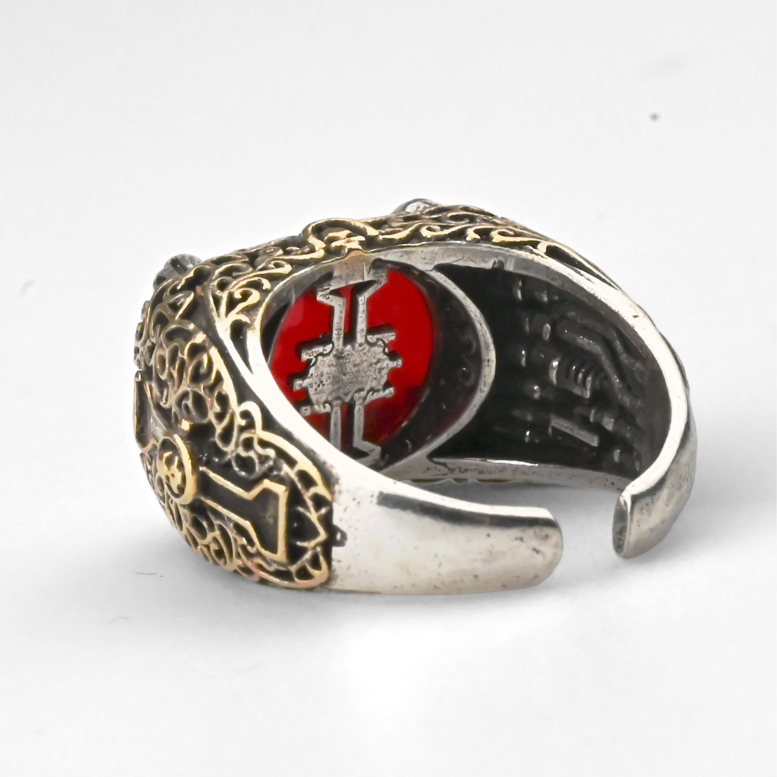 W mrocznej przyszłości jeden symbol rozstrzyga losy – Inkwizycja. Ten regulowany pierścień pozwala nosić jej znak zawsze przy sobie: błyszczący, krwistoczerwony kamień w prostokątnej oprawie trzymają cztery „szpony”. Ramiona zdobi barokowa, złotawa filigranowa ornamentyka na srebrzystym tle, a wyraźne, wypukłe linie tworzą elegancką ramę z wąskim motywem klucza po bokach. Przez kamień widać sylwetkę inkwizycyjnego „I” na czerwieni; wewnątrz obrączki powtórzono ten znak w formie negatywu. Otwarty trzon potwierdza dopasowanie „Adjustable Size” i nadaje całości klimat relikwii.