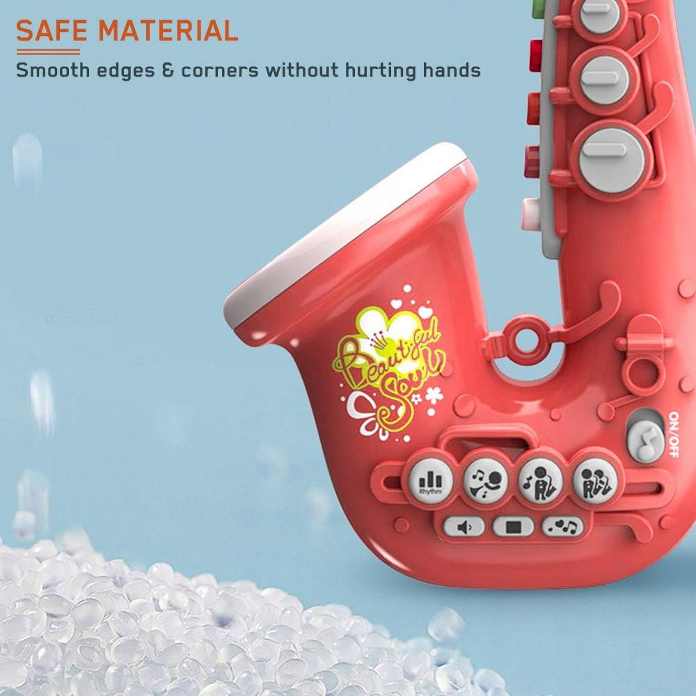 ?Jasny kolor i kolorowe światło: Druk powierzchniowy z pięknymi wzorami, jasny kolor i kolorowe światło sprawiają, że ta zabawka z instrumentem muzycznym saksofiny jest bardzo atrakcyjna dla dzieci.