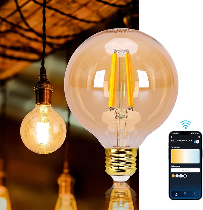 Aigostar Inteligentna żarówka LED E27, 6 W, vintage, G95, bursztynowa kula, 806 lm, ciepła biel, ściemnialna, 2700-6500 K, kompatybilna z Alexa i Google Home, nie wymaga koncentratora, WiFi 2,4 GHz