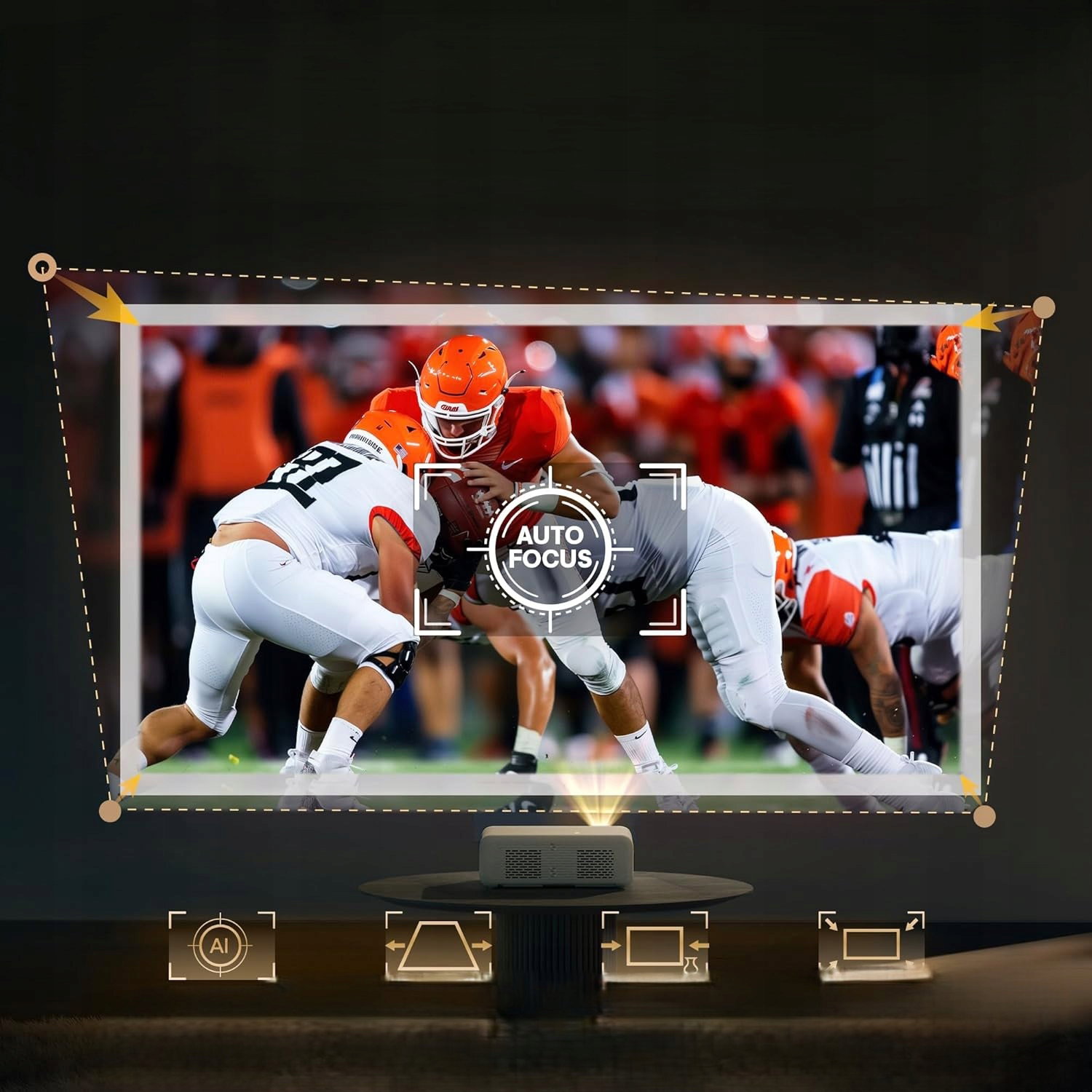 Dzięki zaawansowanemu systemowi autofokusa i automatycznej korekcji trapezu, projektor samoczynnie dostosowuje kąt i ostrość obrazu. Bez względu na to, gdzie umieścisz projektor, system optyczny błyskawicznie poprawia geometrię i ostrość, eliminując konieczność ręcznej regulacji. Dodatkowe funkcje, takie jak automatyczne unikanie przeszkód i inteligentna orientacja obrazu, pozwalają dostosować projekcję do każdej powierzchni.