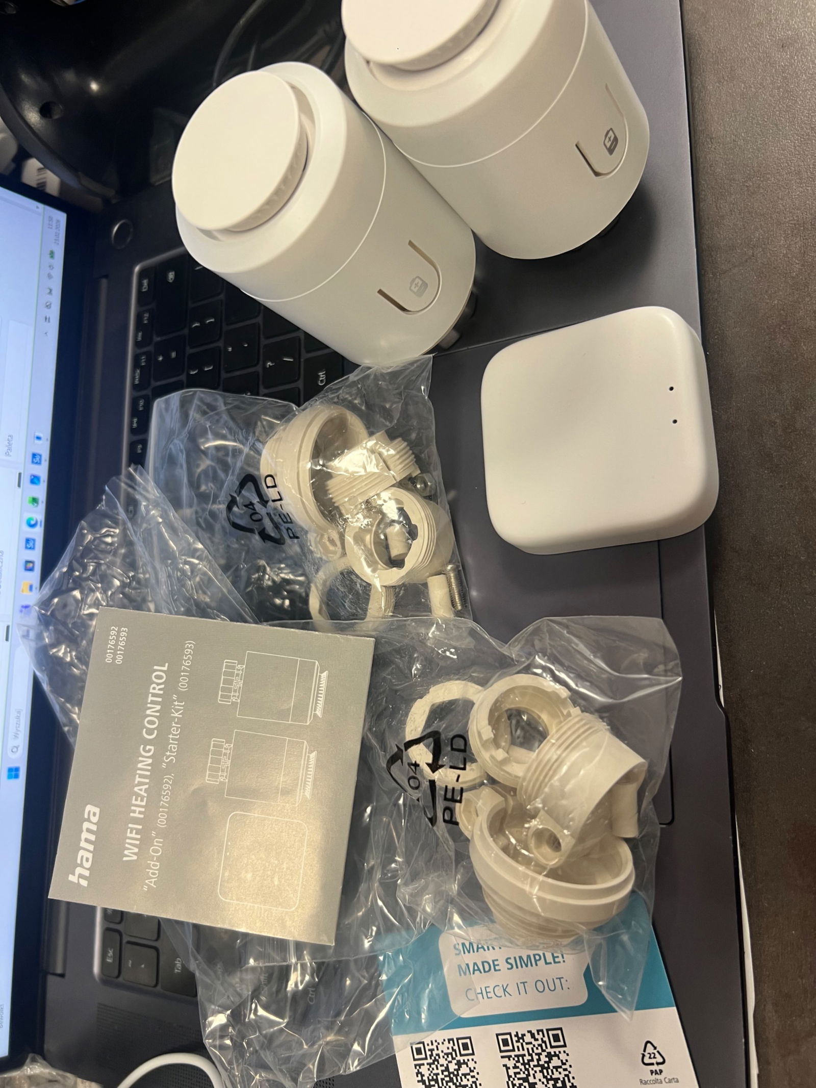 Zakres dostawy: 2 x termostat do grzejników Smart Home, 1 x centralna (skok), 2 x zestaw adapterów, 1 x zasilacz sieciowy