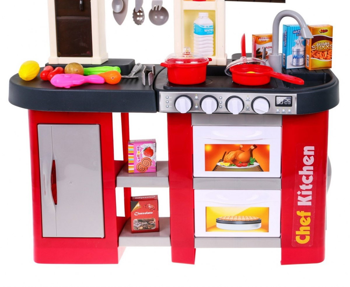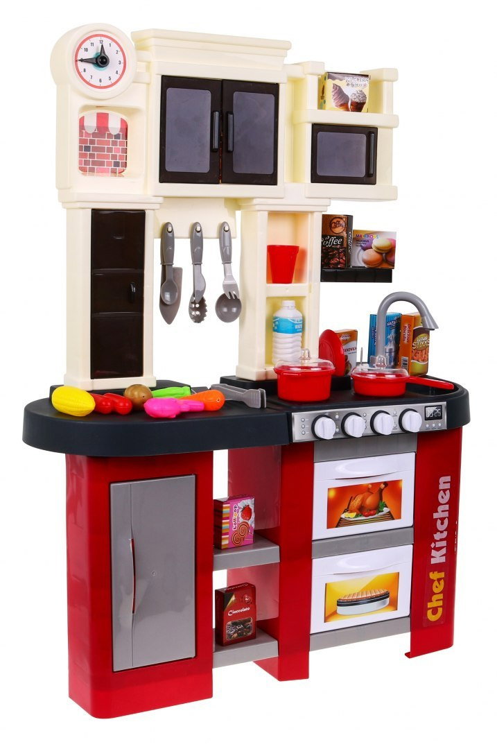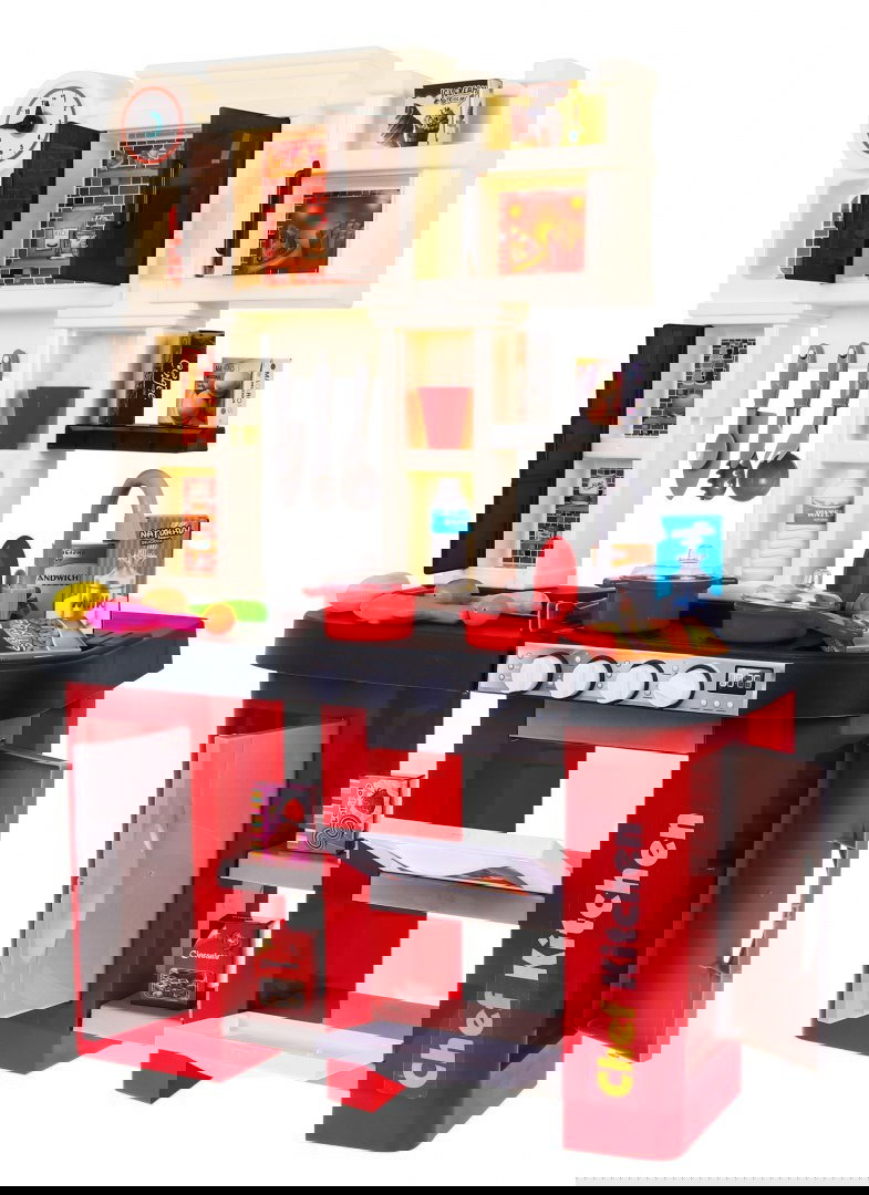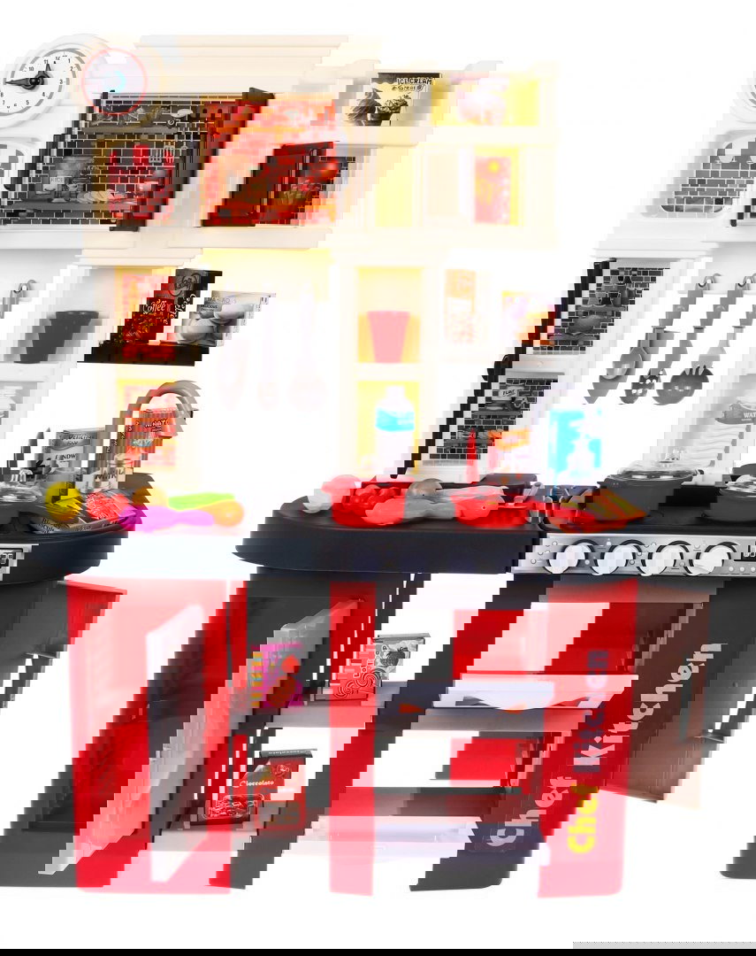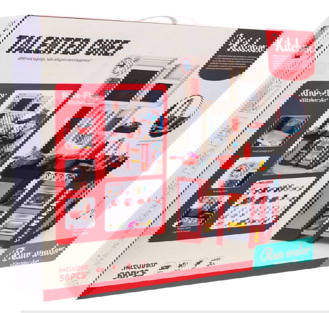 Opis Kuchnia z lodówką, okap, kran z wodą (922-103) Wysokiej jakości, duża kuchnia interaktywna z prawdziwą bieżącą wodą z kranu, światłami i dźwiękami gotowania oraz smażenia.Zestaw z pewnością spodoba się każdemu małemu szefowi kuchni.Zabawka idealna zarówno dla chłopca jak i dziewczynki.Zabawka przeznaczona jest dla dzieci od 3 – go roku życia i posiada certyfikat CE.Zabawka zasilana jest bateriami typu 3 x AA (brak w zestawie). Opis funkcji kuchni:1. Palniki po przekręceniu wydają odgłosy (gotowanie, smażenie).2. Palniki podświetlają się przy gotowaniu.3. Zegar z ruchomymi wskazówkami.4. Kranik z prawdziwą wodą.5. Możliwość otwierania piekarnika, szafeczek, lodówkiZestaw składa się z 58 elementów.Zawartość zestawu- kuchnia z kranem, piekarnikiem, półeczkami, płytą do gotowania, szafeczkami,- naklejki do samodzielnego ozdobienia kuchni,- patelnia z pokrywką ok. 14 cm x 7,5 cm x 5,5 cm,- garnek z pokrywką ok. 10,5 cm x 8 cm x 6,5 cm,- talerzyk średnica ok. 8 cm,- kubeczek ok. 5 cm x 4,5 cm,- butelka ok. 8,5 cm x 3 cm,- chochelka, łopatka, cedzak, szczypce do mięsa ok. 12,5 cm x 3,5cm,- mały widelec, nożyk, łyżeczka ok. 10 cm x 2,5 cm,- duży nożyk ok. 13 cm x 3,5 cm,- warzywa (kapusta, kukurydza, ziemniak, marchewka),- jajko sadzone,- parówki,- jajko,- ryba,- kartoniki z ciasteczkami, kawą, czekoladom, lizakami, ciasteczkami, mlekiem, lodami.Wymiary- wysokość ok. 84 cm,- szerokość ok. 63 cm,- głębokość ok. 35 cm.Wymiary opakowania ok. 69 cm x ok. 55 cm x ok. 14 cm.