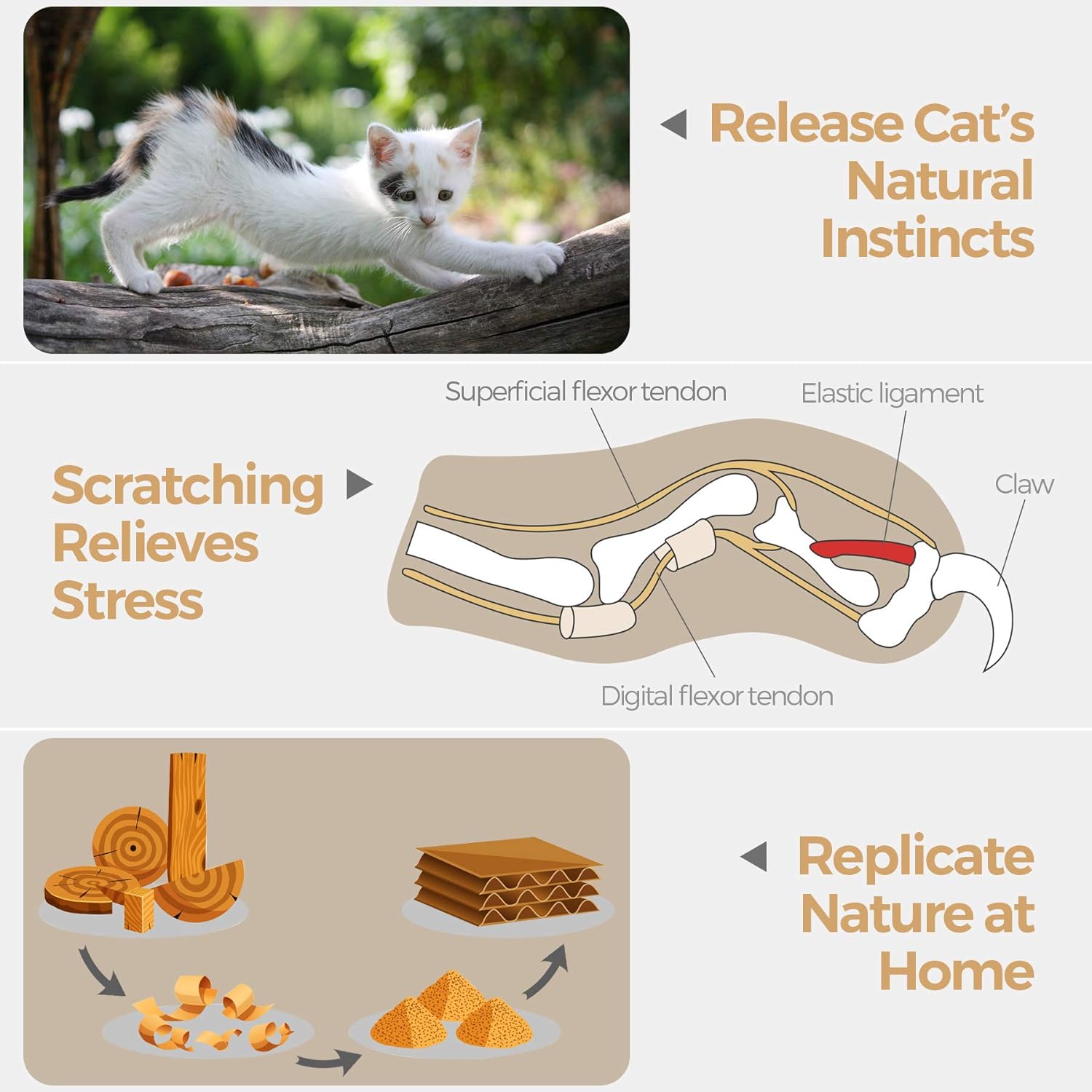 - Zdrowe i nadające się do recyklingu - Wykonane z poddanej recyklingowi, twardej tektury falistej. Jest nieszkodliwe dla kotów. W przypadku kotów domowych drapanie może pomóc im się zrelaksować, uwolnić od stresu i zaspokoić ich ciekawość, co trzyma je z dala od Twoich wewnętrznych mebli.