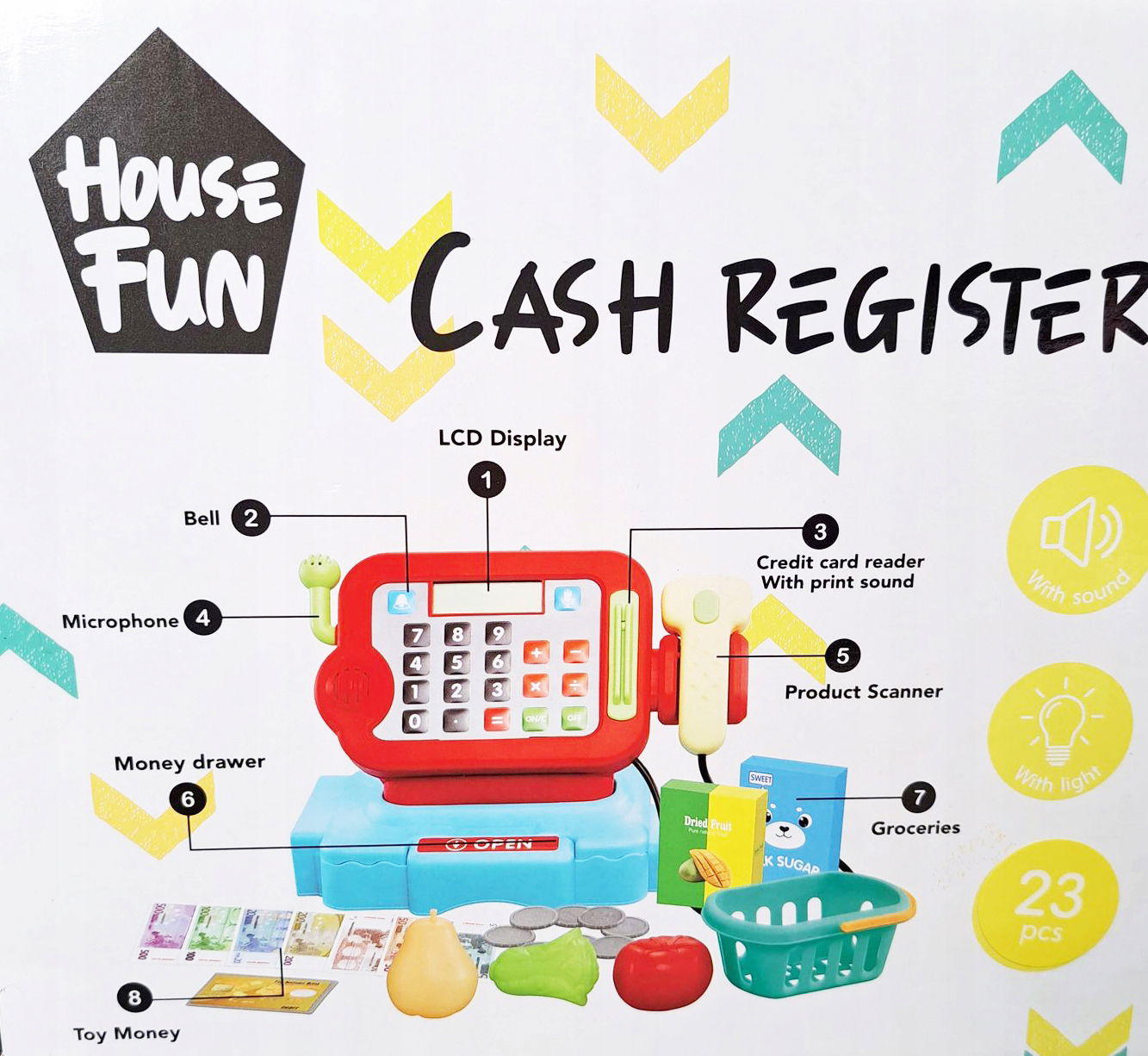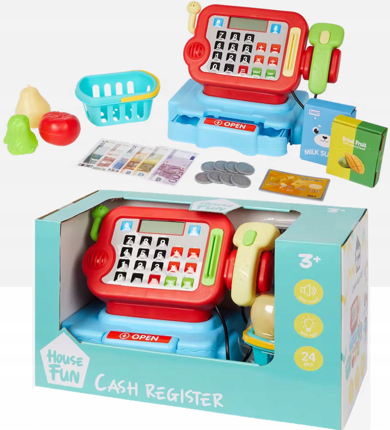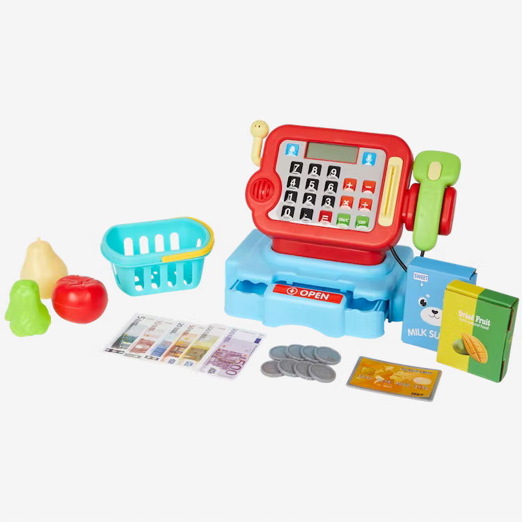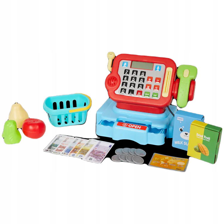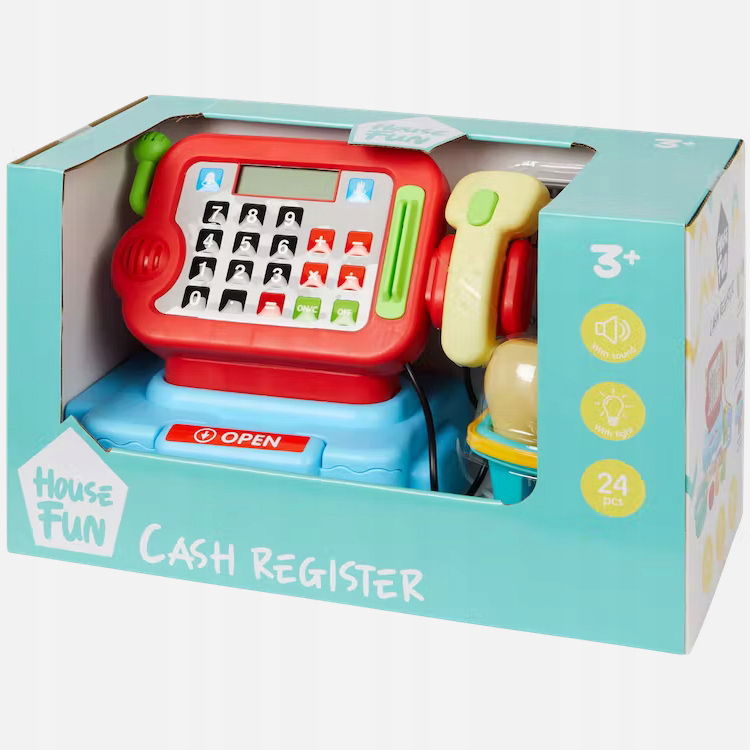 Zeskanuj wszystkie produkty przy użyciu tej kasy. Światło i dźwięk sprawiają, że wydaje się prawdziwa. Pamiętasz, jak włożyć pieniądze do szuflady?