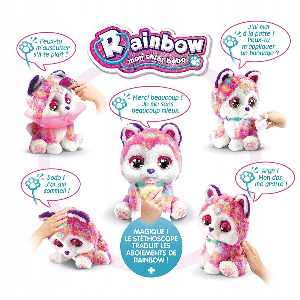 Interaktywny: Rainbow to mały, w pełni zmotoryzowany, chory pies, którym należy się opiekować: Rainbow porusza głową, mruga oczami, podciąga się i podnosi.