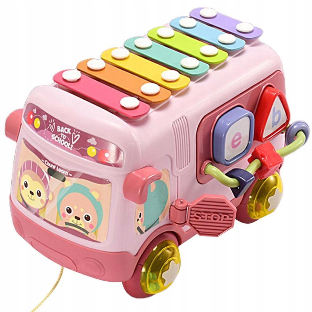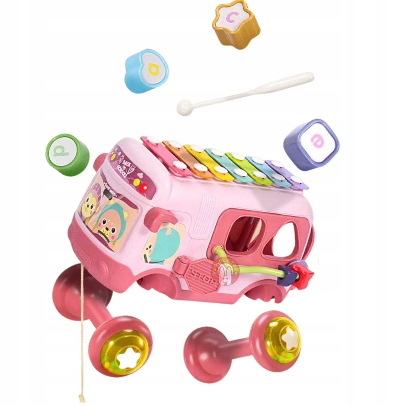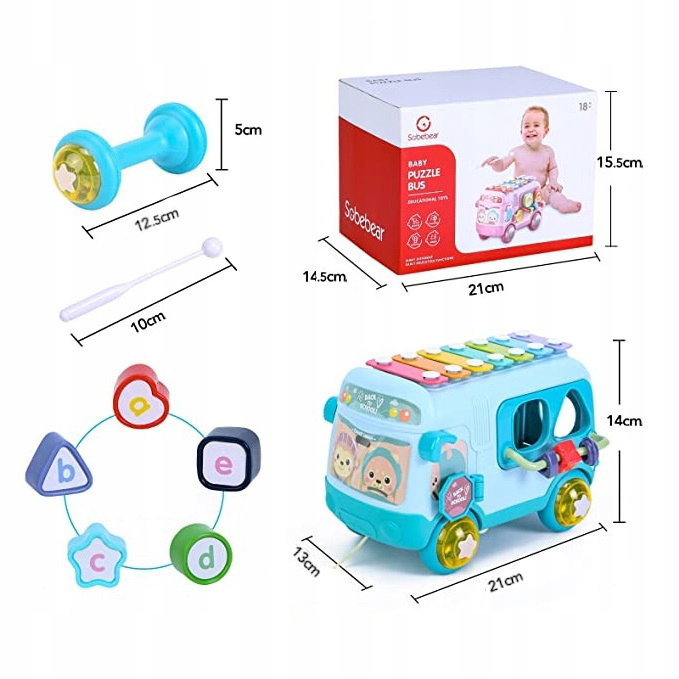 Interaktywny autobusik z sorterem, cymbałkami i grzechotkami to edukacyjna zabawka dla malucha. Rozwija zdolności manualne i koordynację ruchową. Posiada metalowe cymbałki, klocki do sortera z literkami, grzechotki-koła, otwieraną klapę bagażnika oraz sznureczek do ciągnięcia.