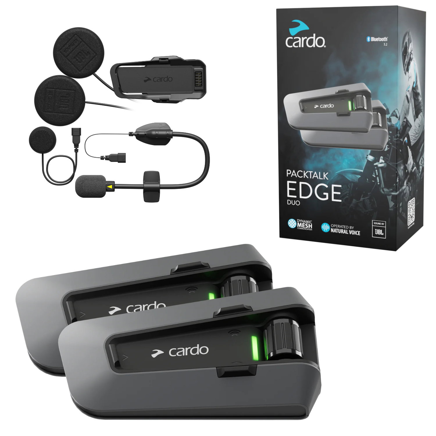 Interkom motocyklowy DUO 2-pak Edge Mesh 2.0 Bluetooth Cardo | PT200101 /// CARDOKod produktu: PT200101Nowy, oryginalny zestaw interkomów z oficjalnej polskiej dystrybucji, zawierający dwa pełne zestawy montażowe do kasków otwartych, szczękowych i integralnych. W zestawie znajdziesz polską instrukcję obsługi, magnetyczne bazy montażowe, oryginalne słuchawki JBL 40 mm,dwie centralki (dwa interkomy,które mogą działać niezależnie lub w grupie) oraz naklejkę z logo Cardo.