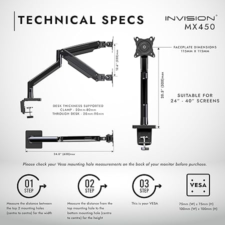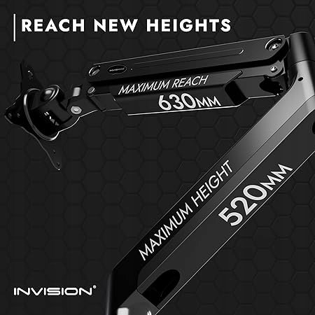 - Szeroki zakres ruchu zapewnia korzyści dla zdrowia i wydajności – ustawienie monitora komputerowego dla ergonomicznego komfortu przyczynia się do zmniejszenia zagrożeń dla zdrowia podczas dłuższego siedzenia przy biurku. Invision MX450 zapewnia duży zakres wysokości i zasięgu, dzięki czemu masz duży zakres kąta widzenia. Optymalizacja miejsca pracy i pozycji ekranu może mieć bardzo pozytywny wpływ na produktywność, zdrowie i dobre samopoczucie