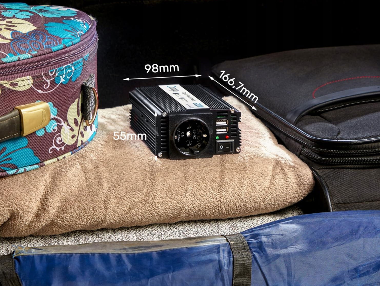 Zintegrowane gniazda 220 V oraz podwójne złącza USB 2,1 A pozwalają na jednoczesne ładowanie do czterech urządzeń. Falownik można podłączyć do gniazdka samochodowego lub bezpośrednio do akumulatora, zapewniając elastyczność użycia.