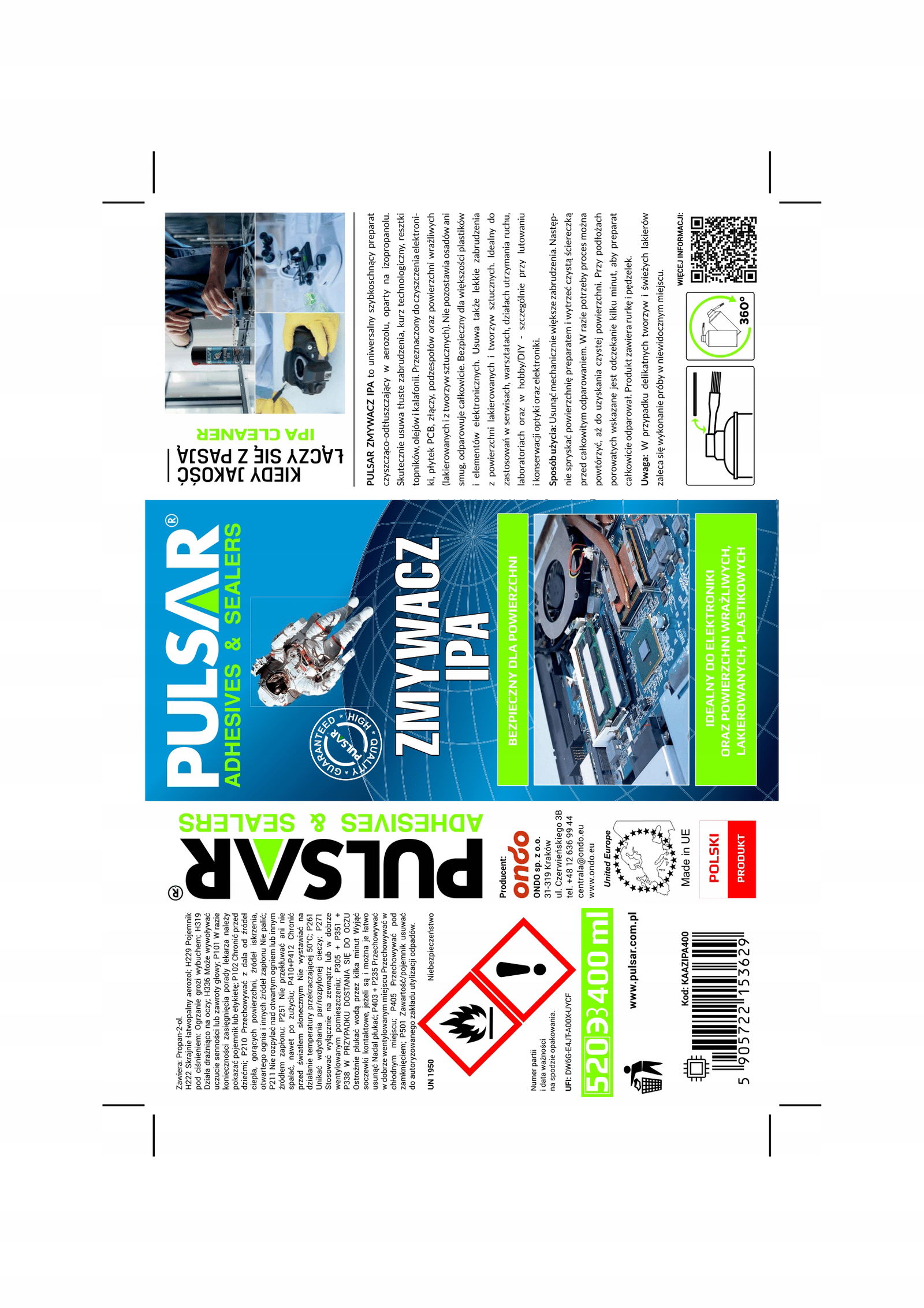 IPA ALKOHOL IZOPROPYLOWY PULSAR ZMYWACZ DO ELEKTRONIKI SPRAY 400 ml