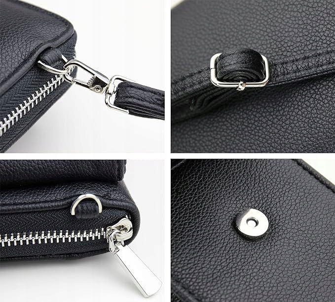 - Zamknięcie: z przodu kieszeń na telefon komórkowy z zapięciem na zatrzask i zapięciem magnetycznym, z tyłu na portfel z zamkiem błyskawicznym