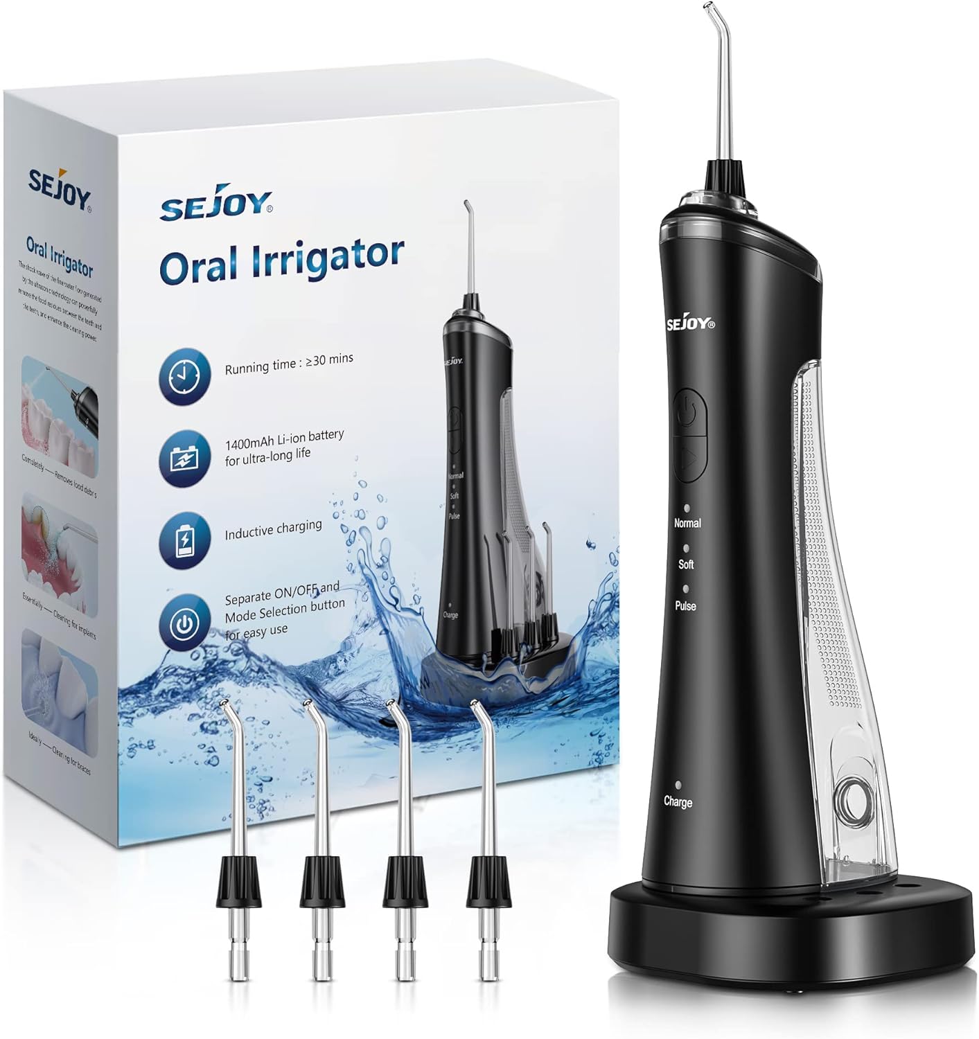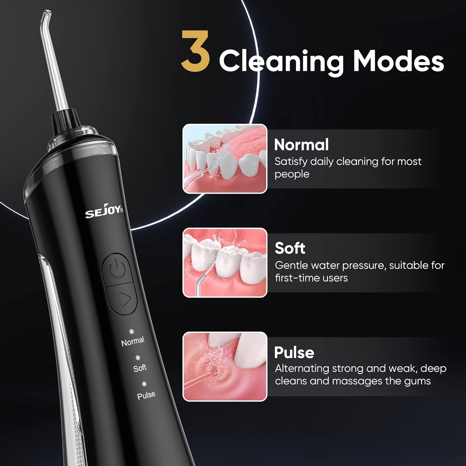 Delikatny (> 40 PSI) – do delikatnego czyszczenia wrażliwych dziąseł. Normalny (90 PSI) – zapewnia skuteczne czyszczenie. Masaż pulsacyjny, zmiana prędkości 30-90 psi, aby dokładnie oczyścić zęby i masować dziąsła. Proszę wybrać tryb miękki, jeśli używasz nici dentystycznej po raz pierwszy.