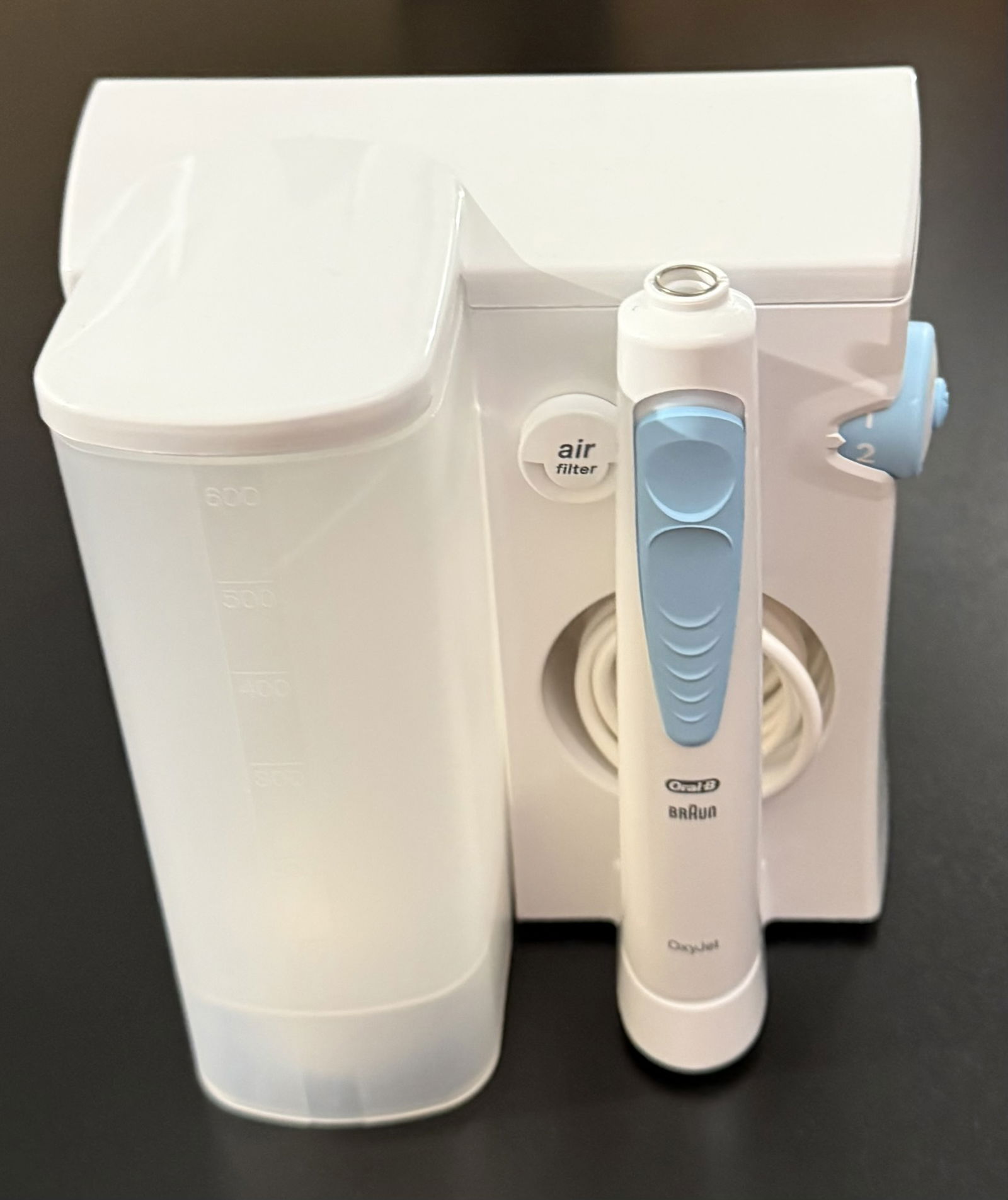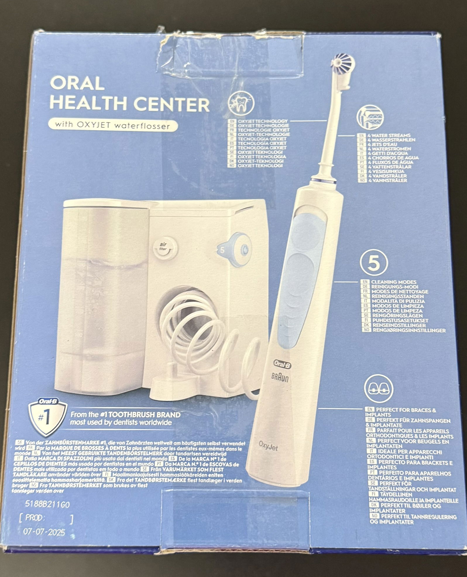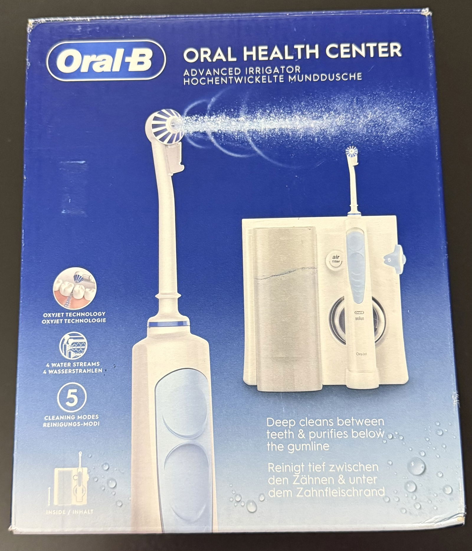 Irygator do jamy ustnej Oral-B Oral Health Centre, szczoteczka międzyzębowa do delikatnego czyszczenia zębów i zdrowszych dziąseł, z technologią Oxyjet, 5 poziomów ciśnienia do pielęgnacji zębów, biało-niebieski