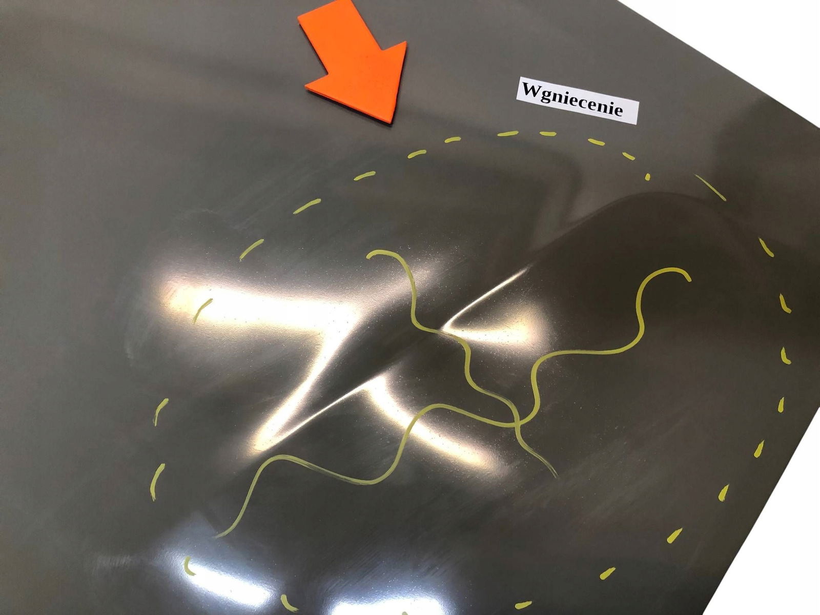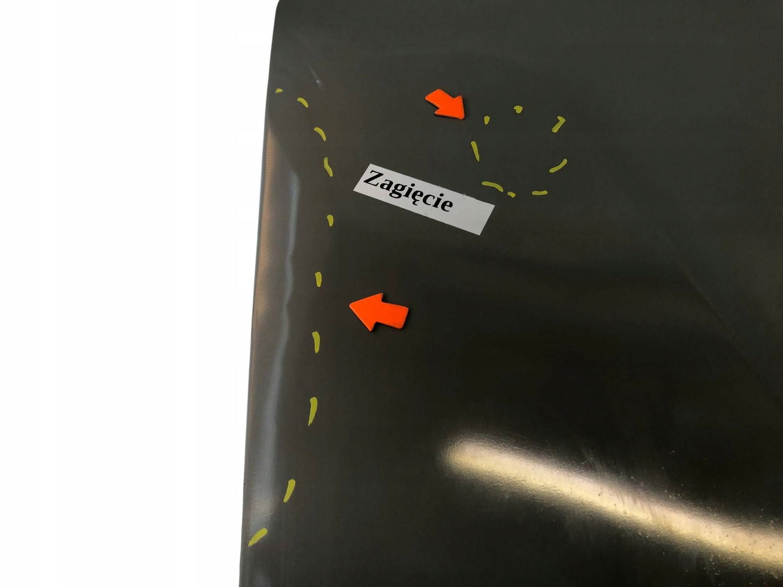 Zagięcia, wgniecenia, delikatna fala na dolnym rancie.