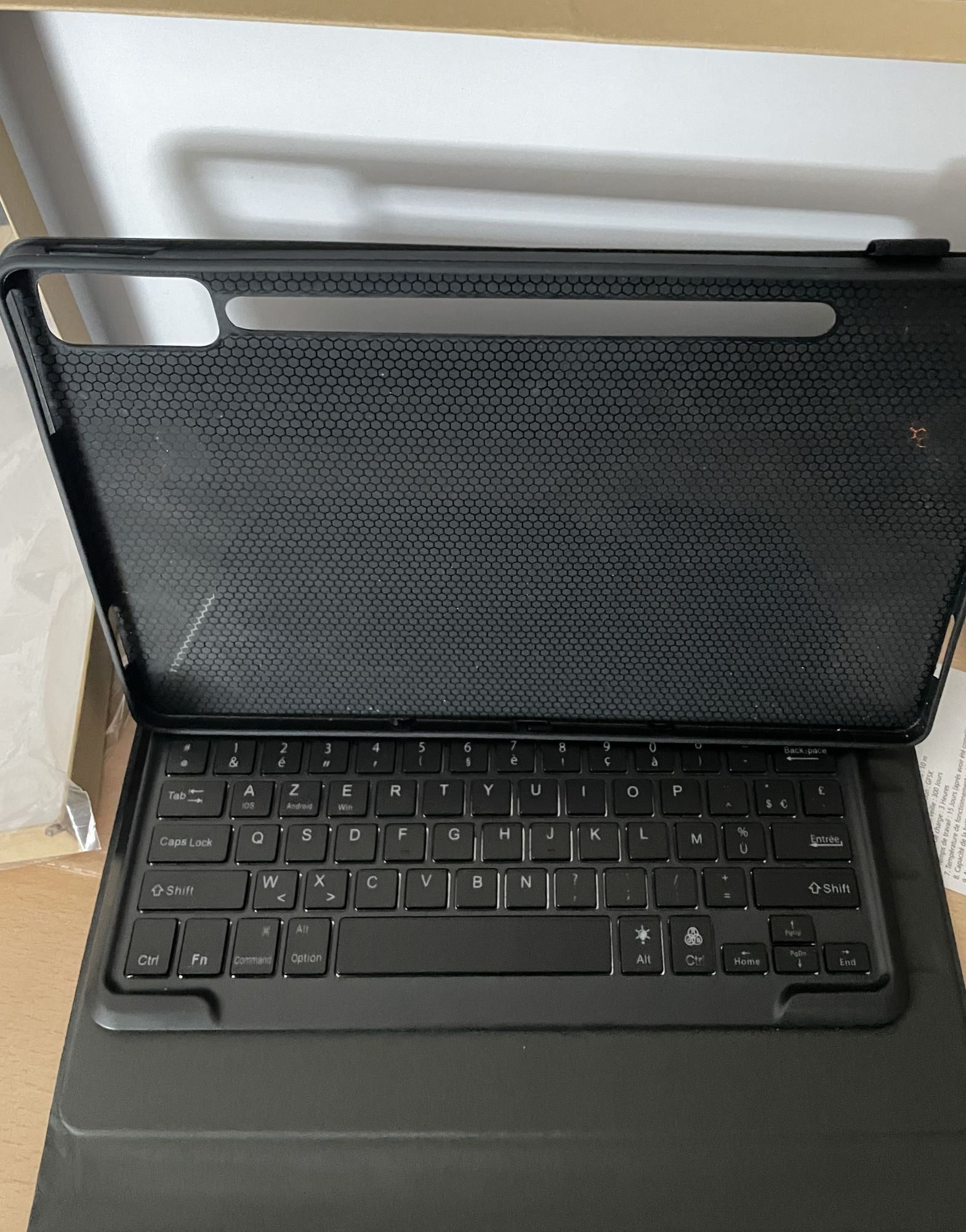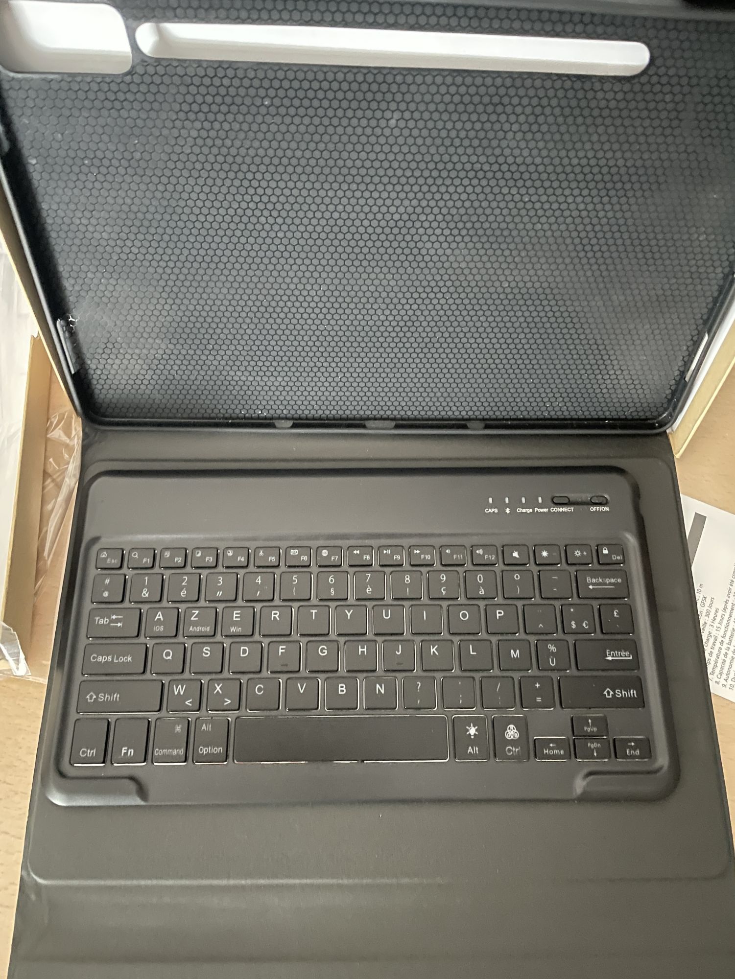 - W zestawie: elastyczne czarne etui, czarna klawiatura z układem klawiszy francuskim Azerty, oryginalne pudełko, papierowa instrukcja język francuski, na życzenie tłumaczenie na polski jako pdf