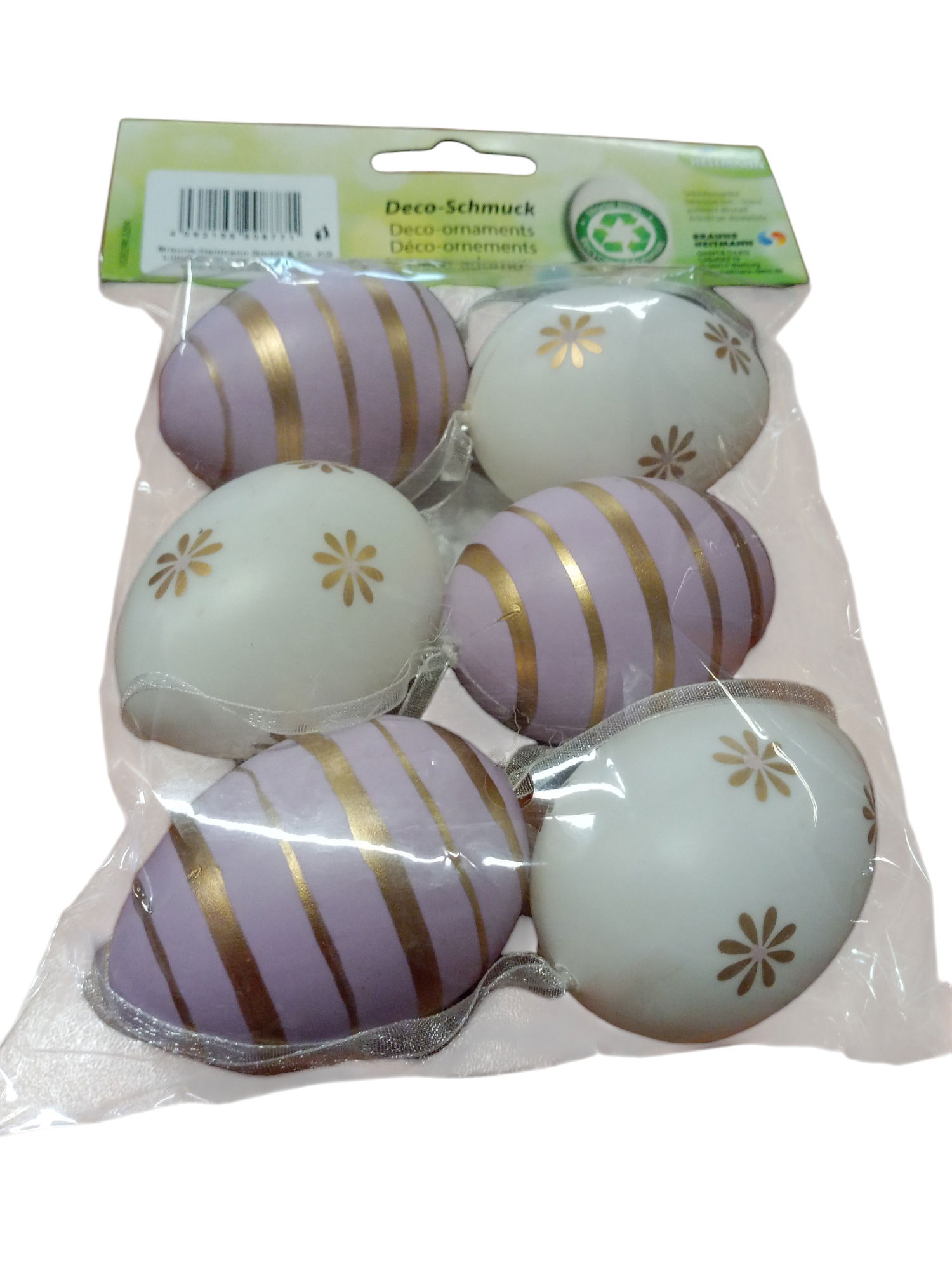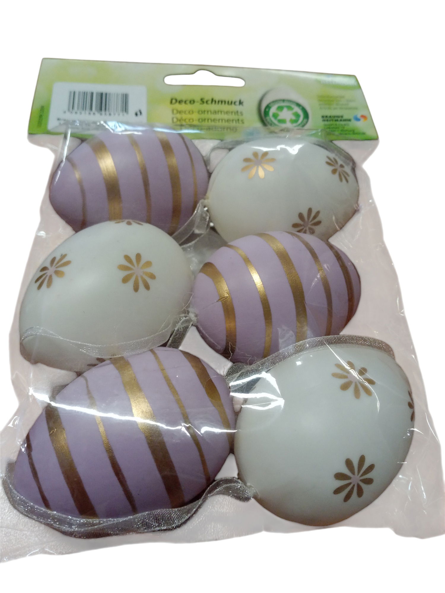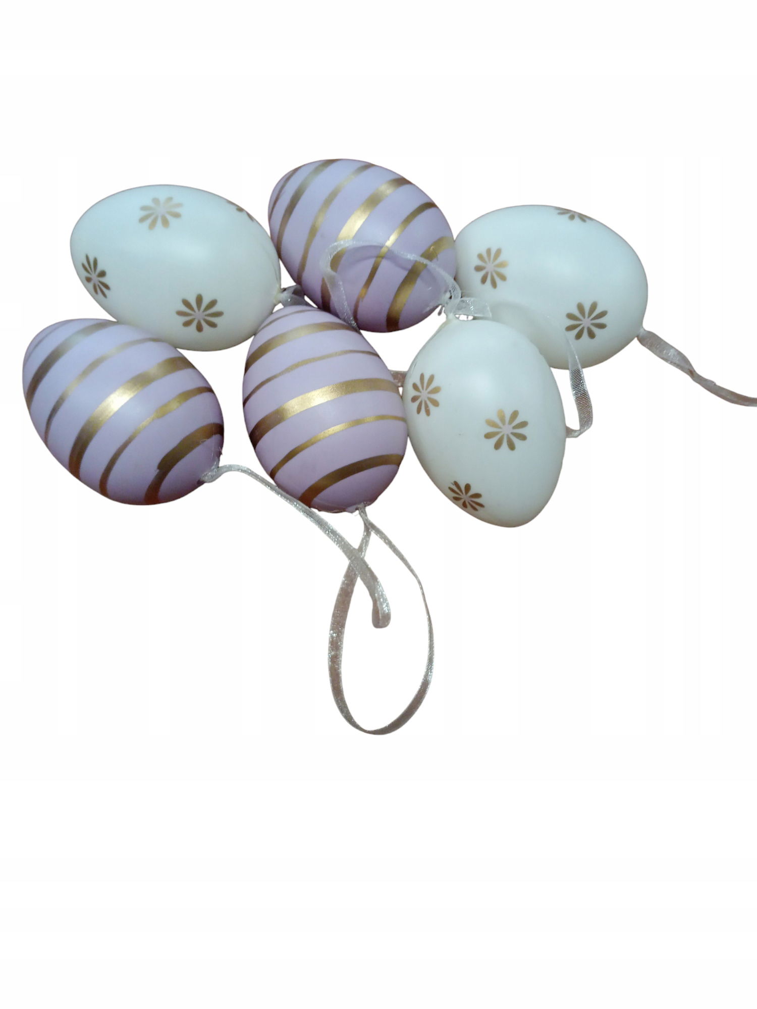 Elegancki komplet plastikowych jajek wielkanocnych w odcieniach fioletu i bieli ze złotymi akcentami, idealny do dekoracji domu, stołu, stroików czy koszyczków. Zestaw składa się z 3 jajek w kwiatki i 3 w paski, co nadaje ozdobom wyjątkowego uroku.