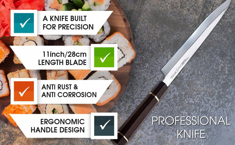 GWARANCJA SATYSFAKCJI – rękojeść jest nie tylko piękna, ale i ergonomiczna – zapewnia pewny chwyt nawet przy długiej pracy, idealna długość i ostrość sprawi, że Twoje sashimi i sushi będą wyglądać jak z najlepszej restauracji w Tokio.