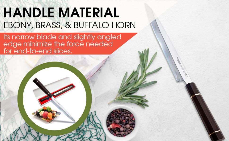 WYGODNY UCHWYT – Każdy porządny nóż kuchenny ma rękojeść, która zapewnia wygodę i ergonomię. Nasz nóż do sashimi nie jest wyjątkiem. Jego rękojeść wykonana jest z hebanu, mosiądzu i rogu bawolego.