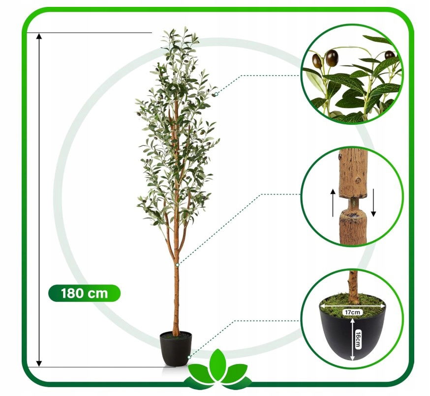 PASCH® 2 x sztuczne drzewo oliwne (180 cm) to stylowe i wierne naturze duże sztuczne rośliny, idealne do stworzenia śródziemnomorskiej atmosfery. Wykonane z wysokiej jakości materiałów, są odporne na blaknięcie i gwarantują wieloletnią trwałość. Zaprojektowane z dbałością o szczegóły, odzwierciedlają wygląd naturalnych drzewek oliwnych, z realistycznymi liśćmi i oliwkami. Tworzą relaksującą atmosferę w pomieszczeniach mieszkalnych i miejscach pracy. Są łatwe w użyciu, nie wymagają podlewania, przycinania ani przesadzania, pozostając wiecznie zielone przez cały rok.