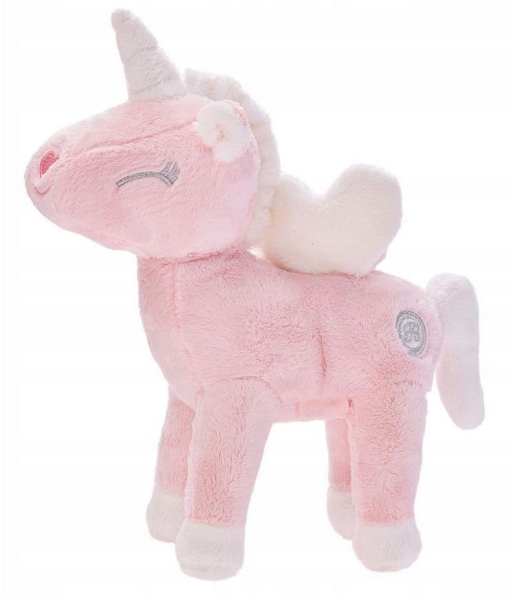Pluszowy jednorożec w kolorze różowo białym .Posiada charakterystyczny dla jednorożca róg i skrzydła. Zwierzątko ma doszyty różowy nosek w kształcie serduszka , grzywę i ogon.Jest pokryty mnóstwem różowych niteczek, które razem odwzorowują sierść. Pluszak jest w pozycji stojącej. Miły w dotyku.