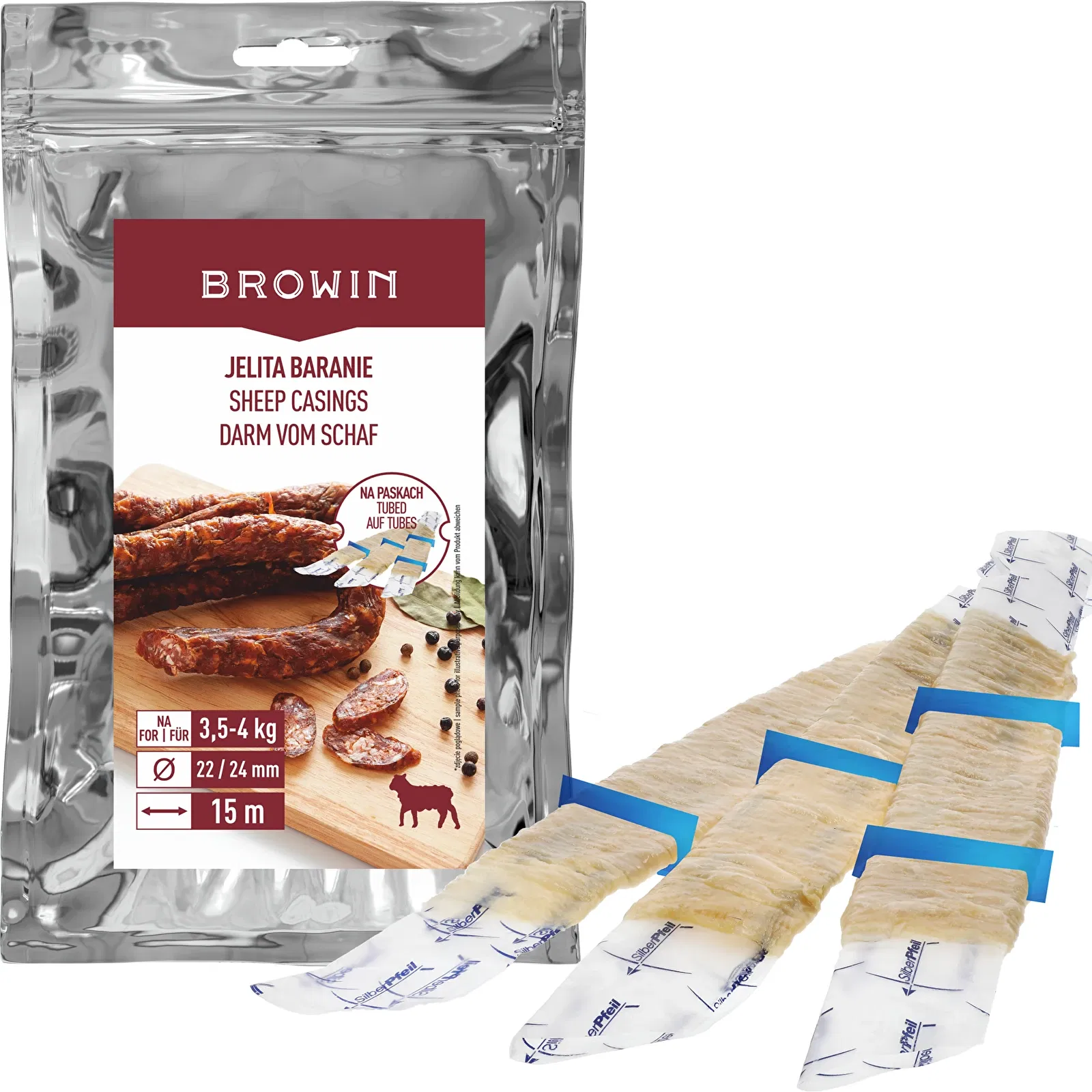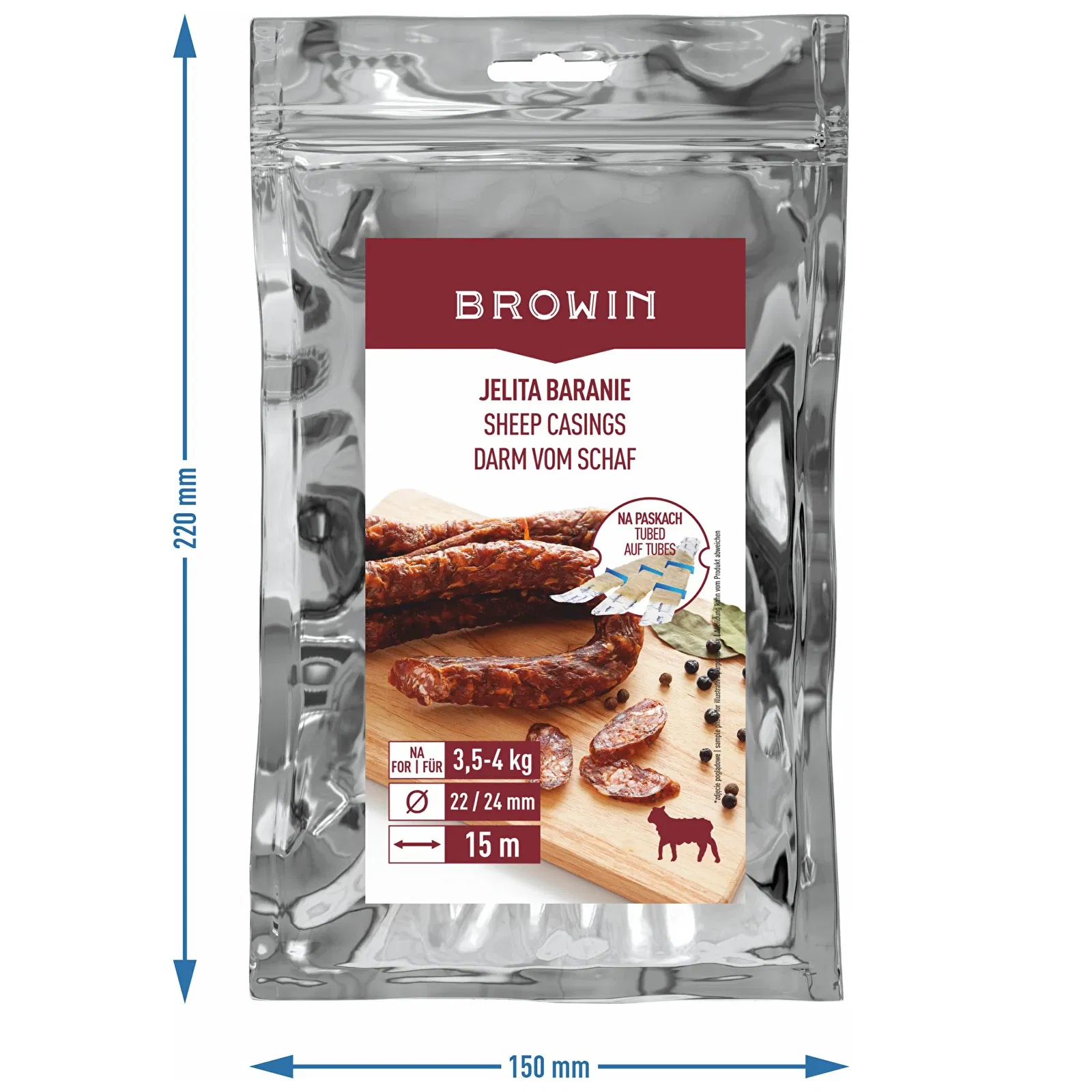 Jelita baranie to doskonała propozycja dla każdego miłośnika domowych wyrobów wędliniarskich. Masz do dyspozycji 15 metrów jelit o średnicy 22/24 mm, na 3,5-4 kg mięsa. Te kalibrowane jelita są na paskach, co ułatwia naciąganie jelit na lejek i eliminuje ich splątanie. Praca pójdzie Ci błyskawicznie i sprawnie!