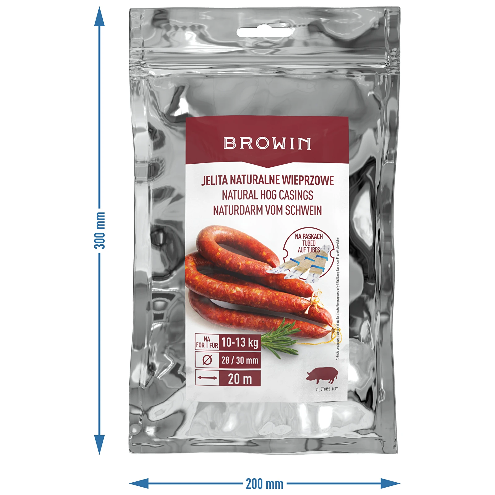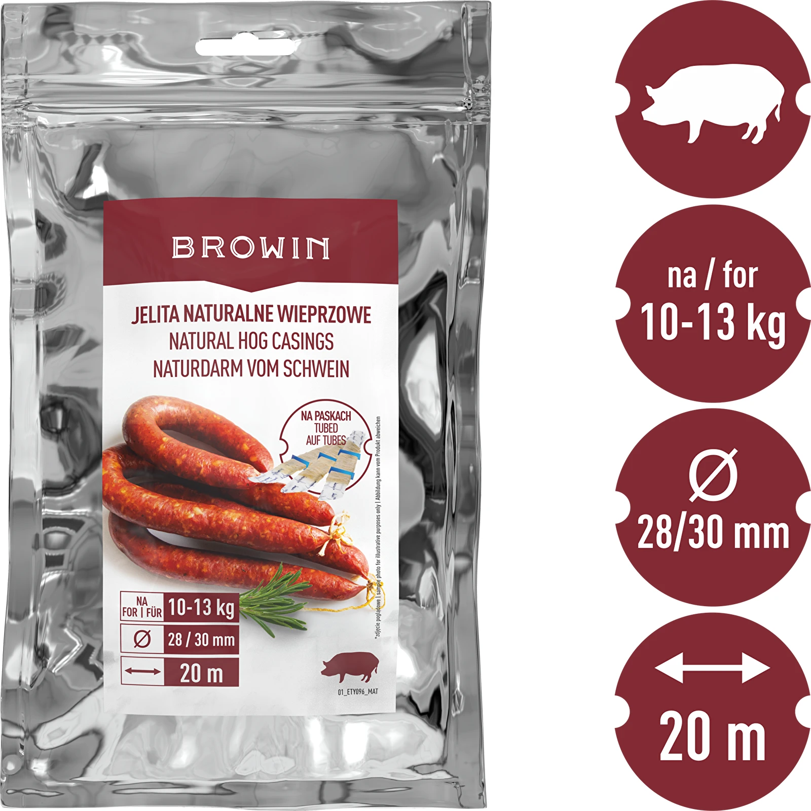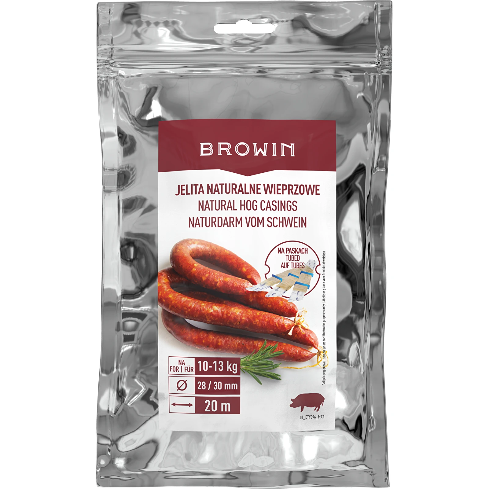 Naturalne jelita wieprzowe o średnicy 28/30 mm, kalibrowane, na paskach, które ułatwiają naciąganie na lejek i eliminują ich plątanie. Z nimi praca pójdzie Ci błyskawicznie oraz sprawnie! Na 10-13 kg mięsa.