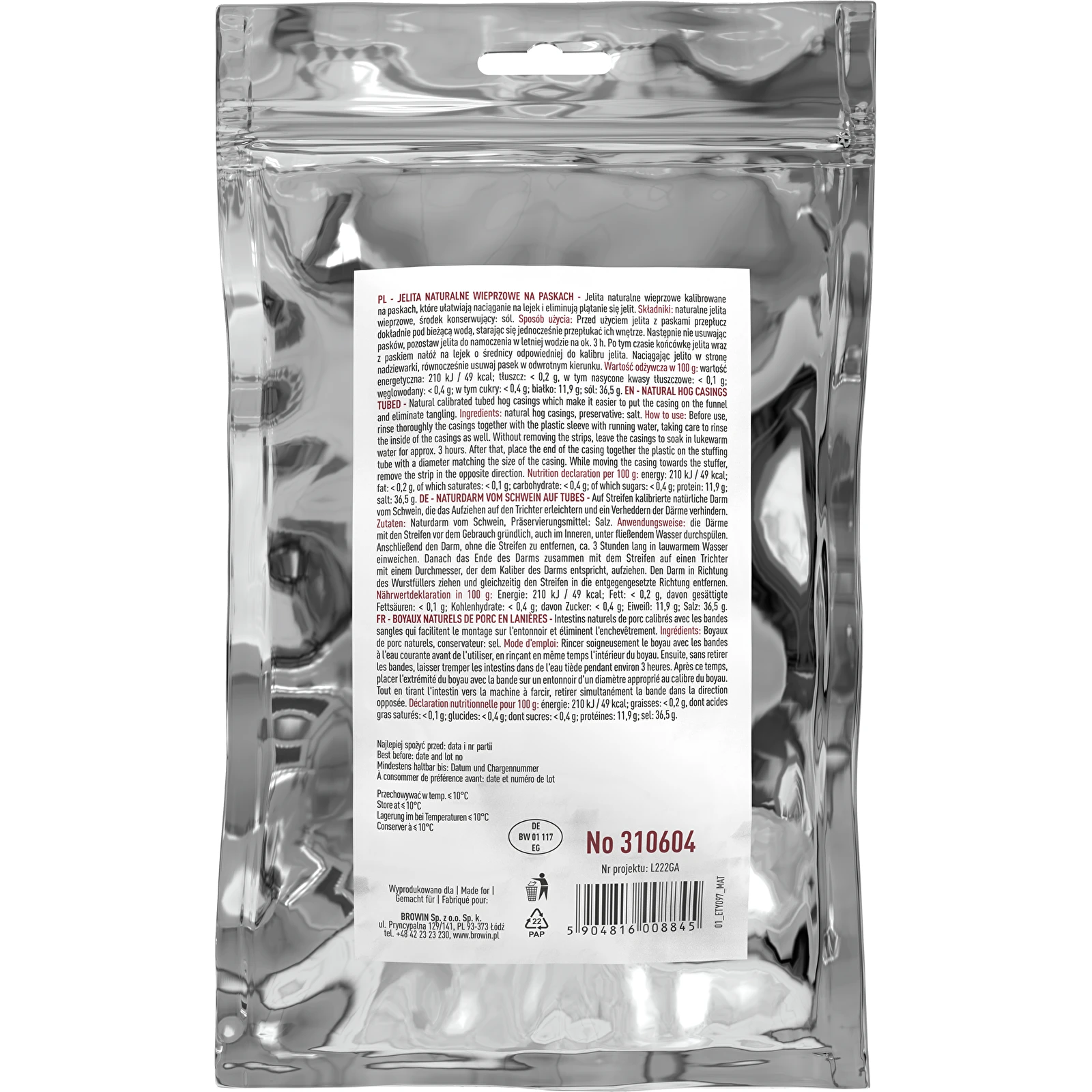 Produkt jest hermetycznie zapakowany i zakonserwowany wyłącznie solą. W jednej paczce łącznie znajduje się 20 m jelit.