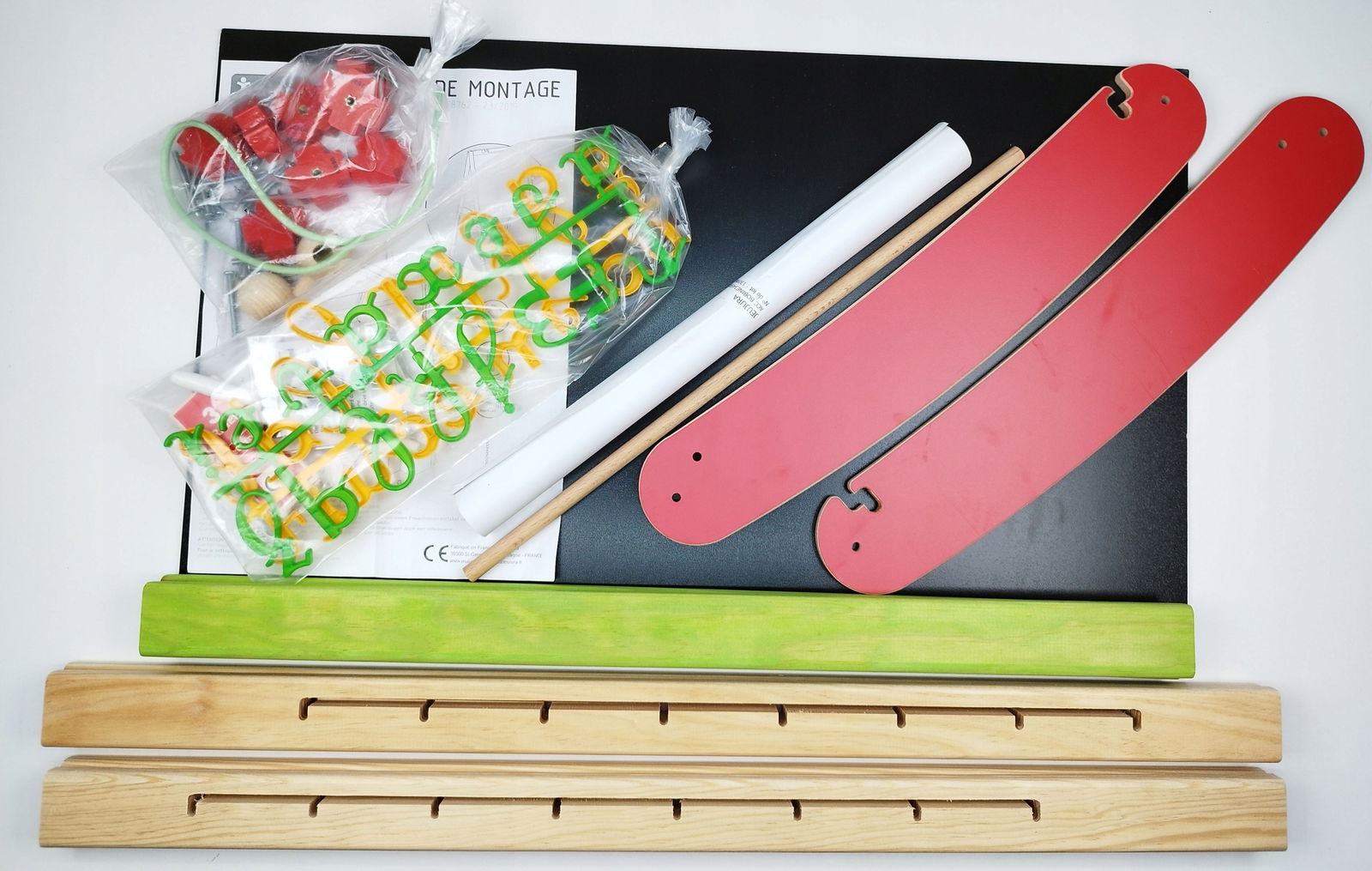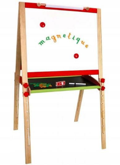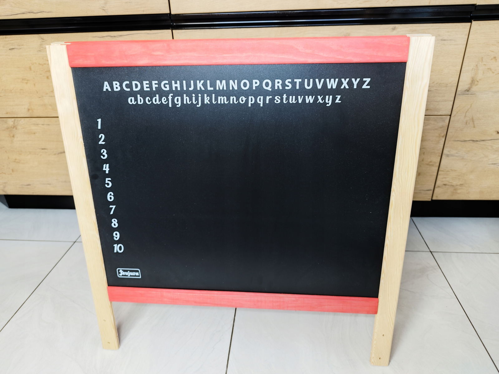 Wielofunkcyjność: Duża drewniana tablica wielofunkcyjna. Składa się z dwóch dużych płytek: strony łupkowej do pisania kredą i białej strony magnetycznej do markerów suchościeralnych i liter magnetycznych. Posiada półkę do przechowywania.