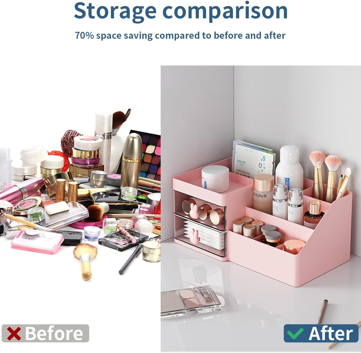 ⭐Wszechstronne przechowywanie w każdym pomieszczeniu: skorzystaj z wielofunkcyjności dzięki wszechstronnemu wzornictwu tego organizera do przechowywania toaletki. Niezależnie od tego, czy na biurku, czy w łazience, jest to najlepsze narzędzie do uporządkowania różnych pomieszczeń. Niezależnie od tego, czy potrzebujesz organizera do makijażu, organizera toaletki, organizera na biurko, organizera łazienki, a nawet stylowego dodatku do wystroju domu, ten wszechstronny blat zapewni Ci wszystko!
