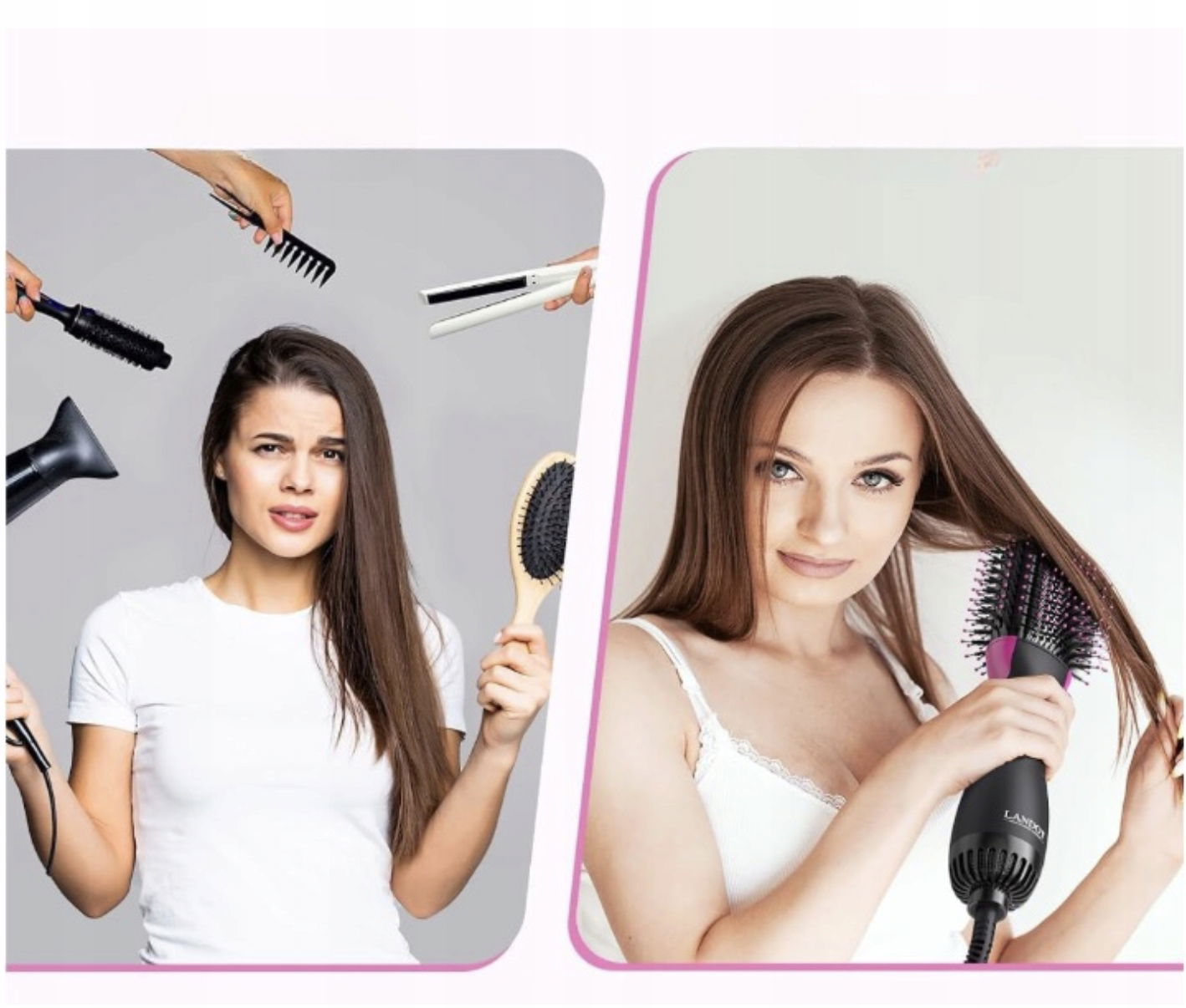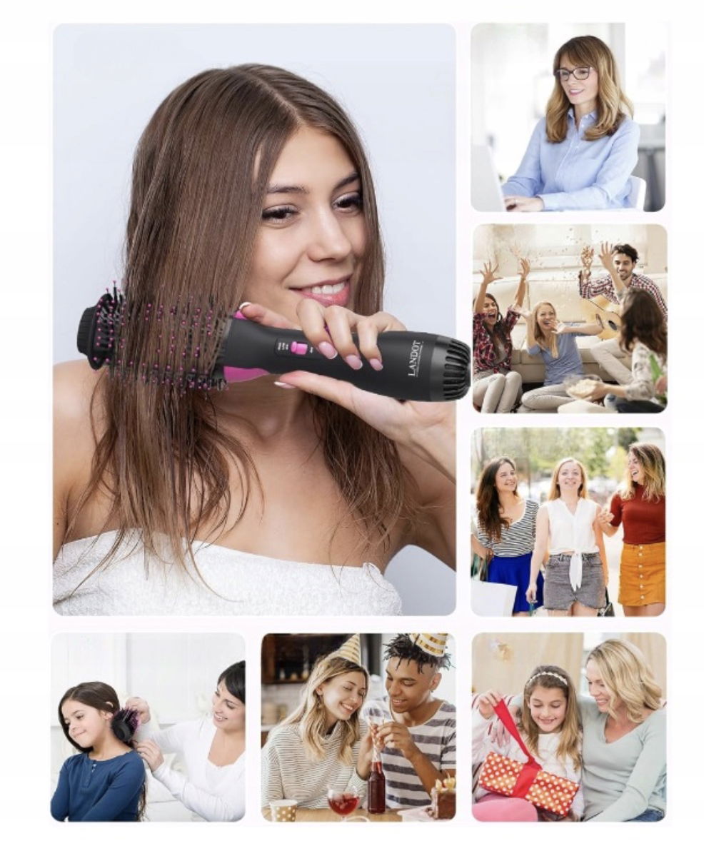 Osiągnij salonowy efekt stylizacji w zaciszu własnego domu dzięki jonowej szczotce do włosów na gorące powietrze LANDOT. Nowoczesne rozwiązanie typu „wszystko w jednym” łączy funkcje suszarki, prostownicy i lokówki, zapewniając doskonałe rezultaty w krótszym czasie. Dzięki technologii jonowej urządzenie eliminuje elektryzowanie się włosów, nadając im naturalny blask i jedwabistą gładkość.