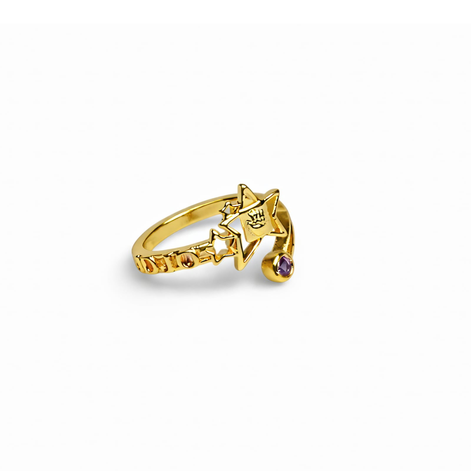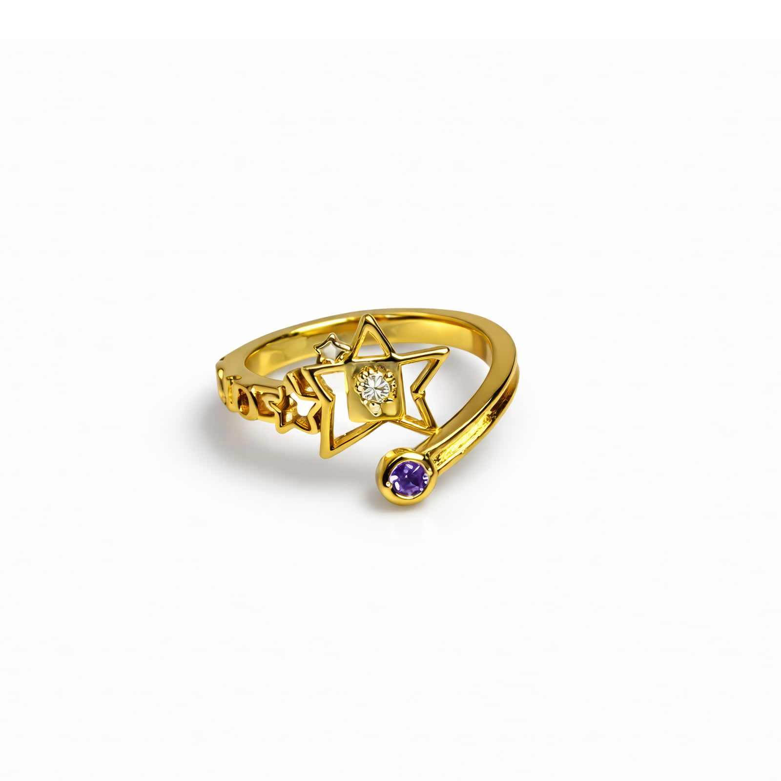 Gwiazda świeci najjaśniej w obliczu niemożliwych przeciwności. Ten regulowany pierścionek metalowy uosabia dumny i stoicki duch Jotaro Kujo, z warstwowanym pierścieniem złotych gwiazd prowadzącym do jego charakterystycznego motywu gwiazdy i oka – z centralnym kamieniem sześciennym zircjonu. Pojedynczy, ametystowy kamień akcentuje skręcany pierścień, odzwierciedlając moc Star Platinum. Noś ten element jako subtelne nawiązanie do bohaterstwa pokoleniowego lub dodaj odrobinę JoJo’s bizarre style do swojego codziennego wyglądu.