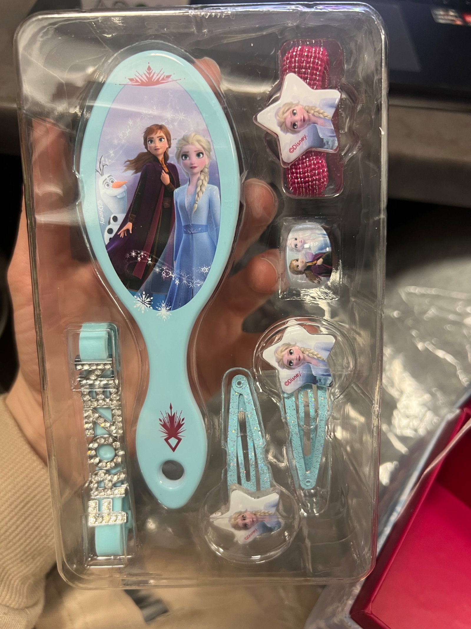 W zestawie znajdziesz: dwie spinki do włosów z Elsą, pierścień z Anną i Elzą, spinkę do warkocza oraz bransoletkę "Frozen" ze strasem. To doskonałe dodatki na każdą okazję!