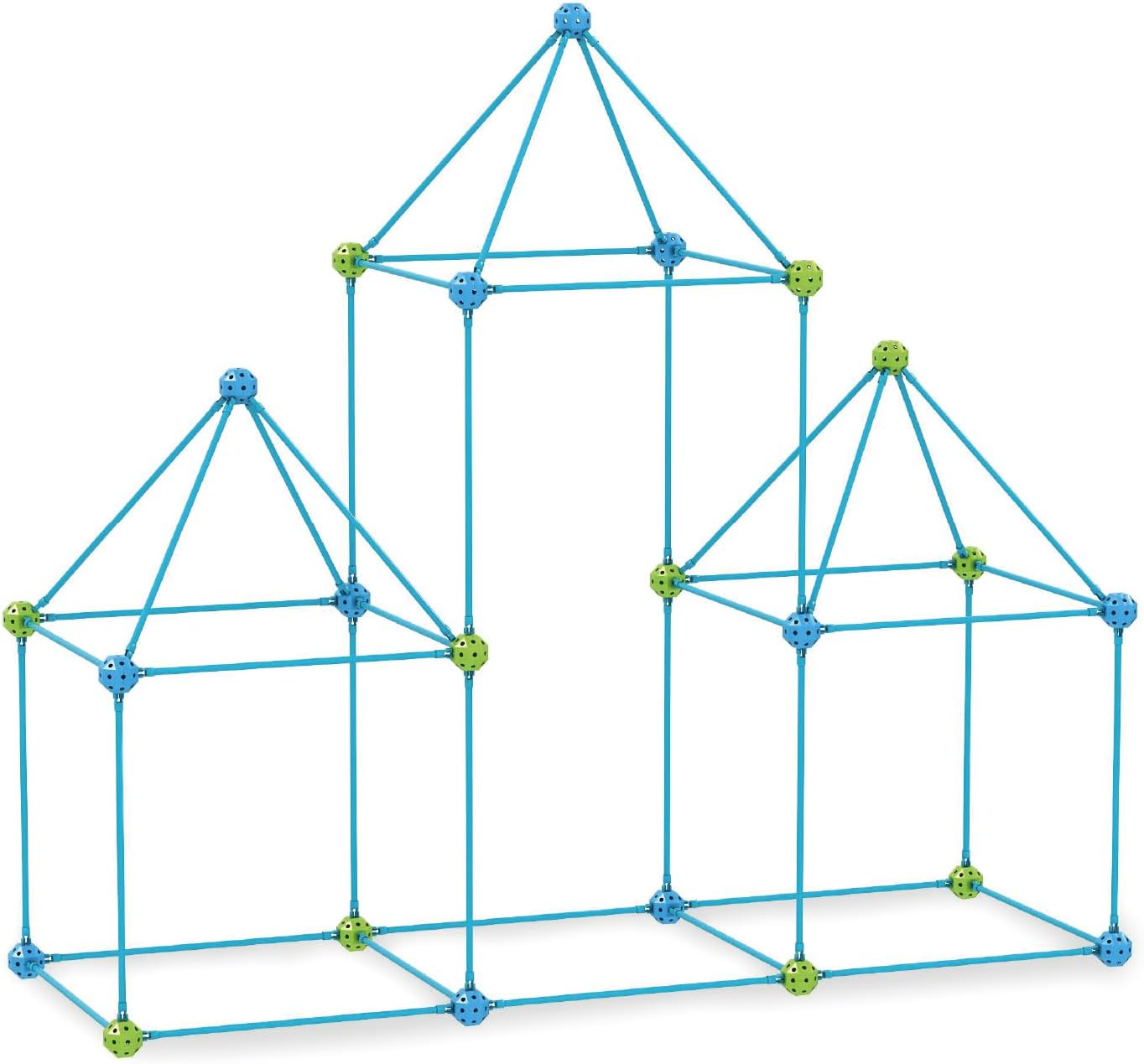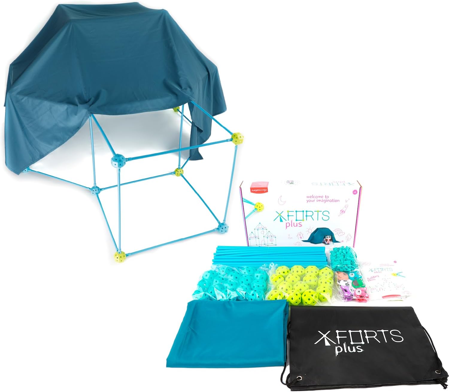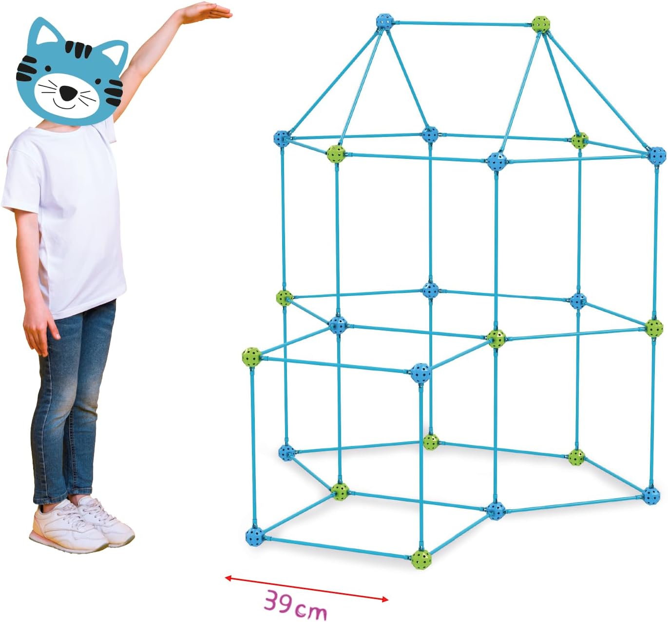 Zestaw montażowy: Ten zestaw zawiera 54 pałeczki z tworzywa sztucznego, 31 łączące kulki, 1 niebieski materiał 150 x 200 cm, aby częściowo pokryć strukturę, 6 klamerek do przypinania, 1 broszurę z pomysłami strukturalnymi i 1 kieszeń do przechowywania wszystkich części. W zestawie znajduje się również 5 wtyczek zamiennych