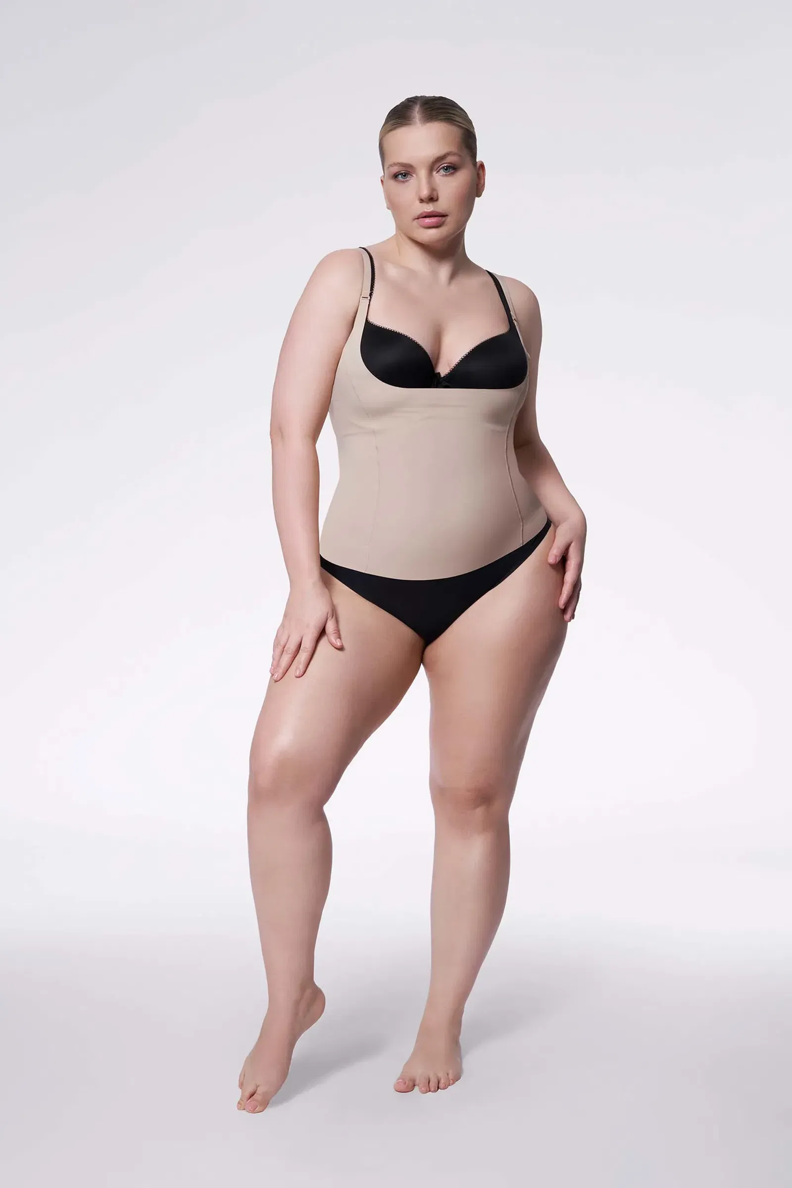 Wyszczuplająca i wygładzająca koszulka pod biust, z parą silikonowych ramiączek w prezencie. Gładka, wykonana w innowacyjnej technologii Invisible Line, właściwie jest niewidoczna pod ubraniem. Posiada innowacyjne zapięcie ramiączek, uniemożliwiające ich przypadkowe wypięcie. Wykończona silikonowym paskiem u dołu (nie podciąga się i nie przesuwa po ciele). Jest bardzo praktyczna. Możesz założyć do niej właściwie każdy biustonosz. Skład: 84% poliamid, 16% elastan.