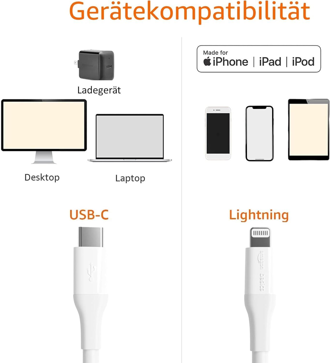 Kabel Amazon Basics Lightning do USB-C, kabel ładujący z certyfikatem MFi do iPhone'a 12/12 Pro/12 Pro Max/11/11 Pro/11 Pro Max/X/XR do ładowarek typu C, obsługuje technologię Power Delivery, biały, 0,9 m