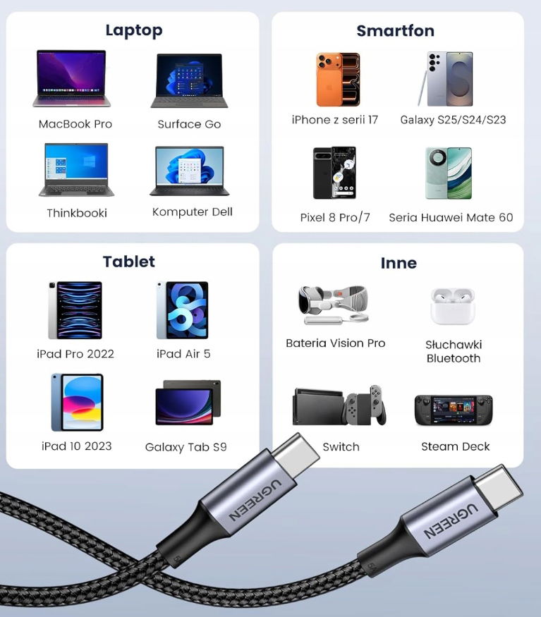 - ✴️Szybkie ładowanie z pełną mocą: kabel UGREEN USB C 100W obsługuje Power Delivery 3.0 i PPS. MacBook Pro 2023 można naładować do 42% w 30 minut za pomocą tego kabla ładującego i odpowiedniego zasilacza USB C, około 58% szybciej niż za pomocą kabla ładującego USB C o mocy 60 W. iPhone'a 15 można naładować od 0 do 60% w 30 minut. Galaxy S24 Ultra można naładować od 0 do 65% w 30 minut.