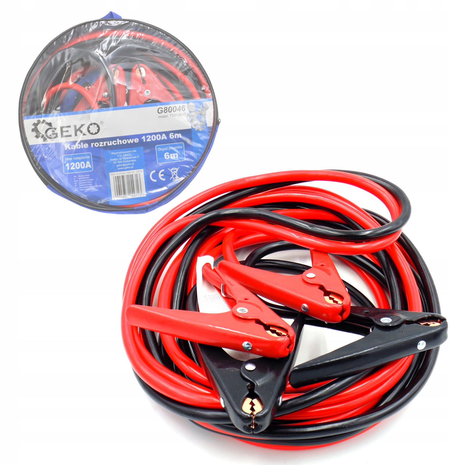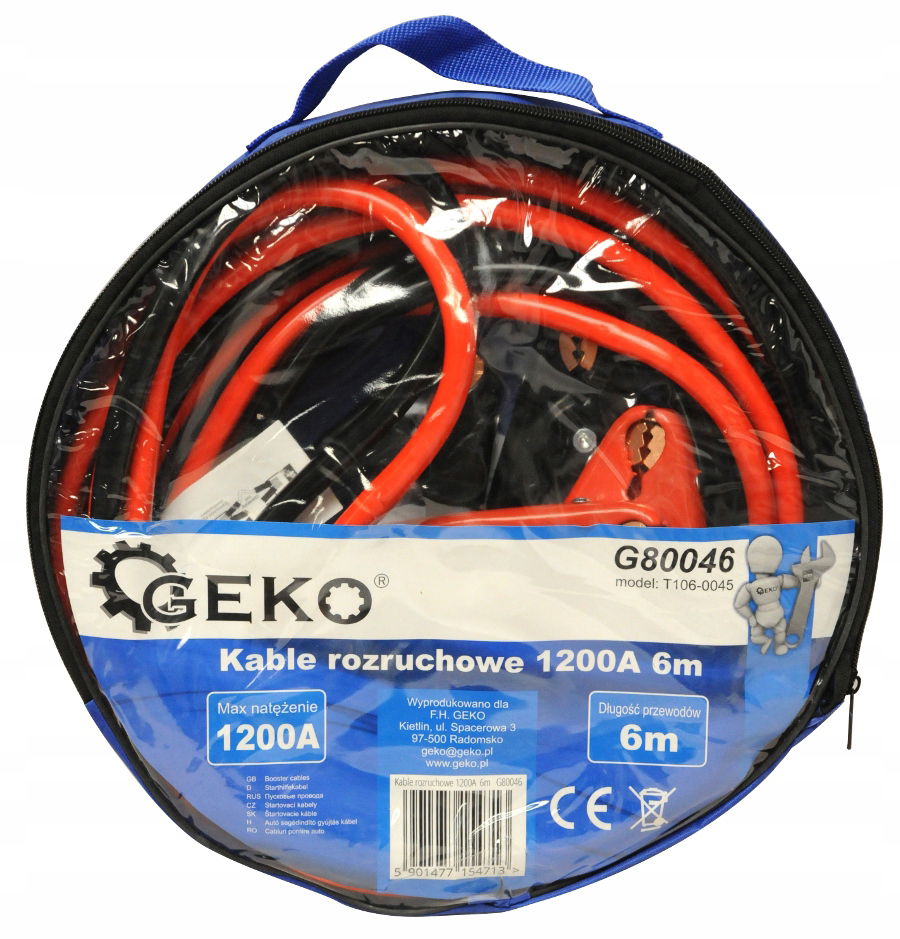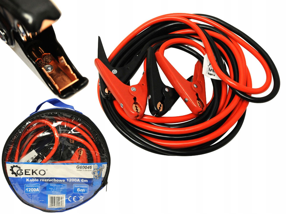 Komplet wysokiej jakości kabli rozruchowych renomowanej marki GEKO o długości 6m, przystosowane do prądu o natężeniu 1200A.
