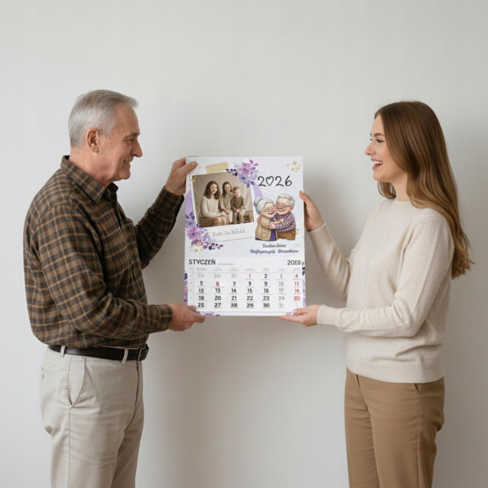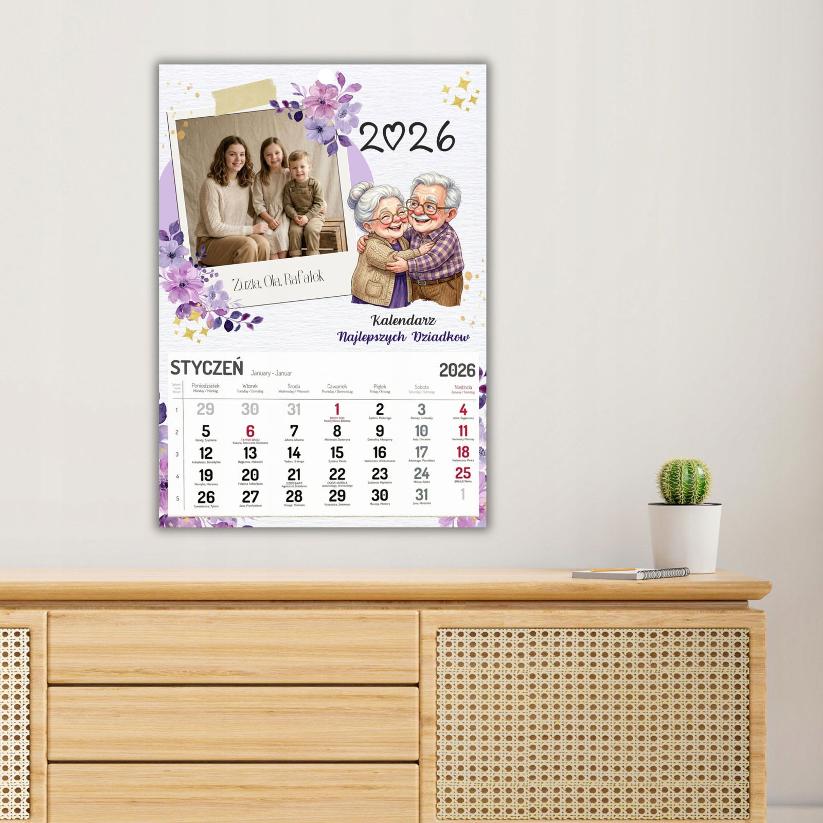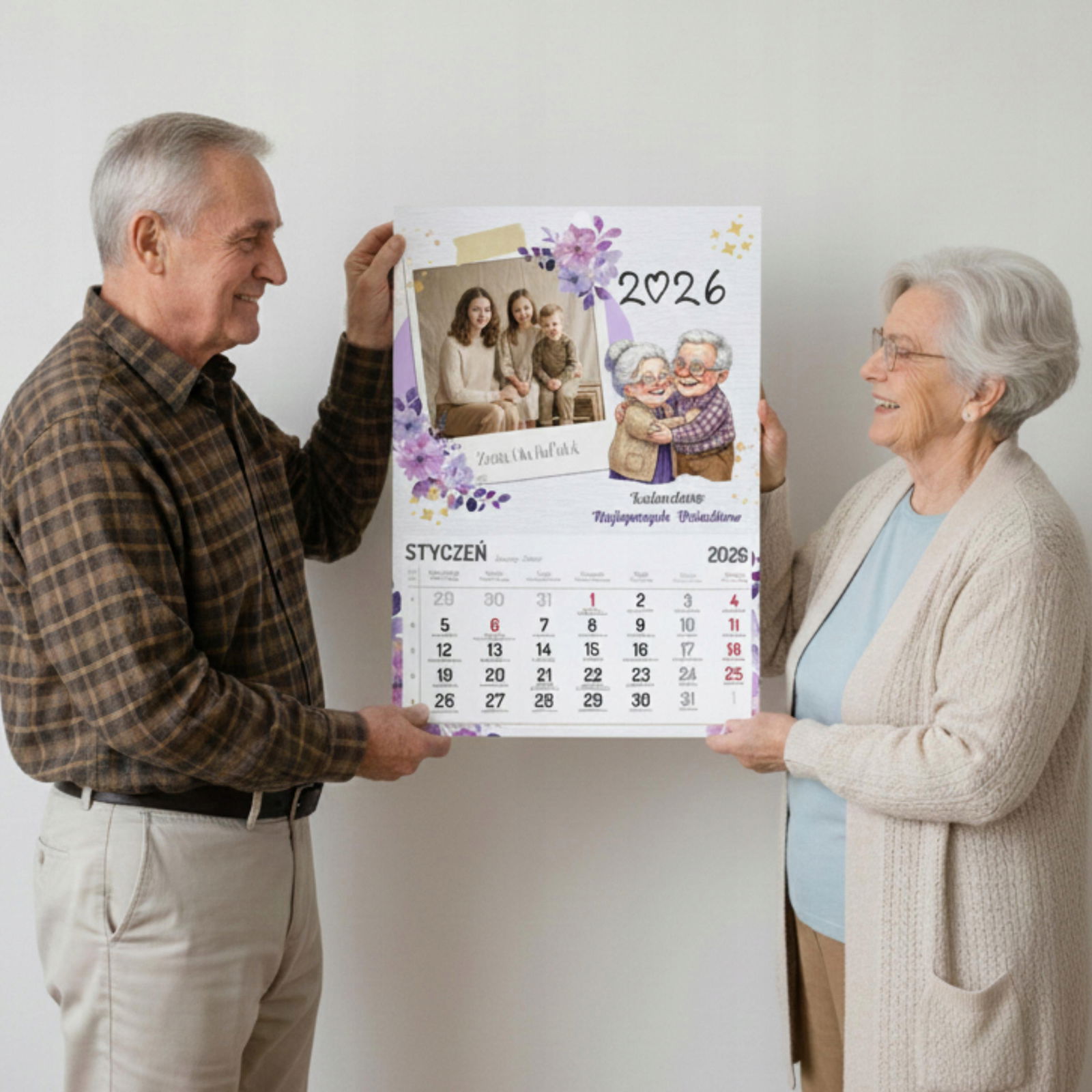 W pełni personalizowany: Na okładce umieścimy Twoje zdjęcie (wnuków, całej rodziny) oraz imiona dzieci! To sprawia, że każdy egzemplarz jest unikatowy. � Przepiękna szata graficzna: Delikatne, akwarelowe kwiaty w odcieniach fioletu oraz ciepła ilustracja przytulonych dziadków dodają całości uroku i elegancji. ? Duży i czytelny: Format A3 (ok. 30x42 cm) oraz wyraźne cyfry w kalendarium (z zaznaczonymi świętami i dniami wolnymi) są idealne dla seniorów. ? Gotowy prezent: Taki kalendarz to gotowy, efektowny upominek, który z dumą zawiśnie na ścianie w kuchni lub salonie Dziadków.