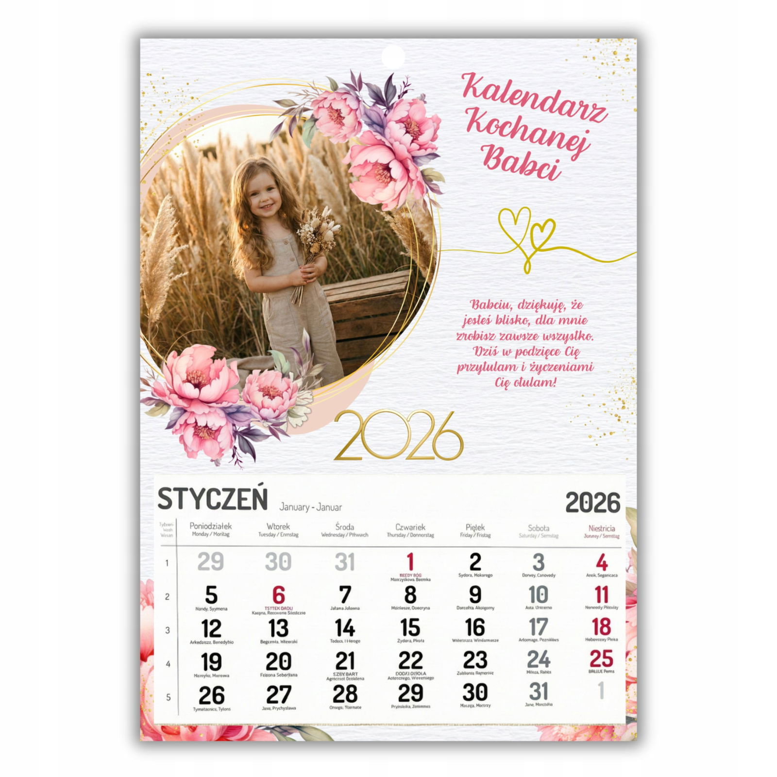W pełni personalizowany: Na okładce umieścimy Twoje zdjęcie (wnuków, całej rodziny) oraz imiona dzieci! To sprawia, że każdy egzemplarz jest unikatowy. � Przepiękna szata graficzna: Delikatne, akwarelowe kwiaty w odcieniach fioletu oraz ciepła ilustracja przytulonych dziadków dodają całości uroku i elegancji. � Duży i czytelny: Format A3 (ok. 30x42 cm) oraz wyraźne cyfry w kalendarium (z zaznaczonymi świętami i dniami wolnymi) są idealne dla seniorów. Gotowy prezent: Taki kalendarz to gotowy, efektowny upominek, który z dumą zawiśnie na ścianie w kuchni lub salonie Dziadków.