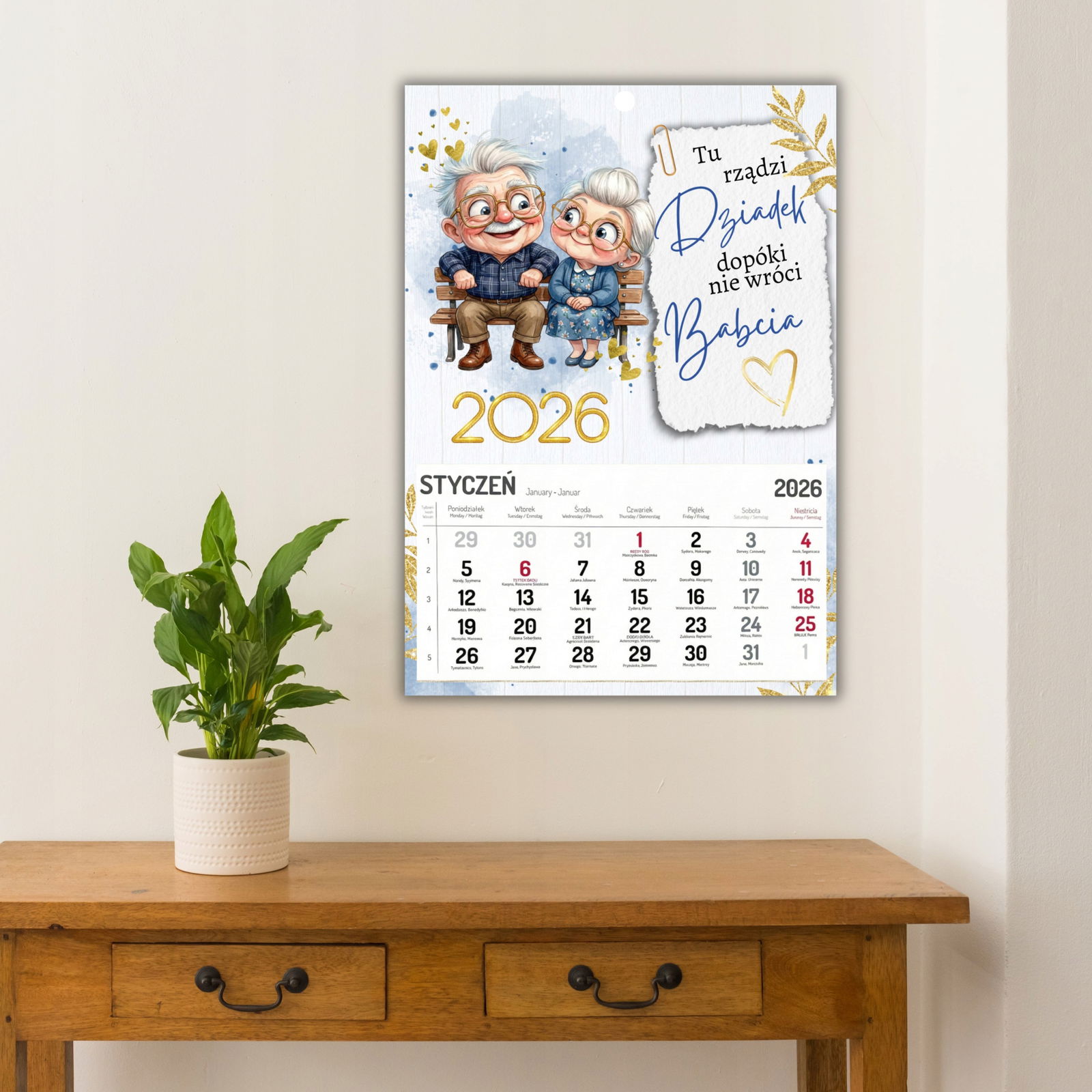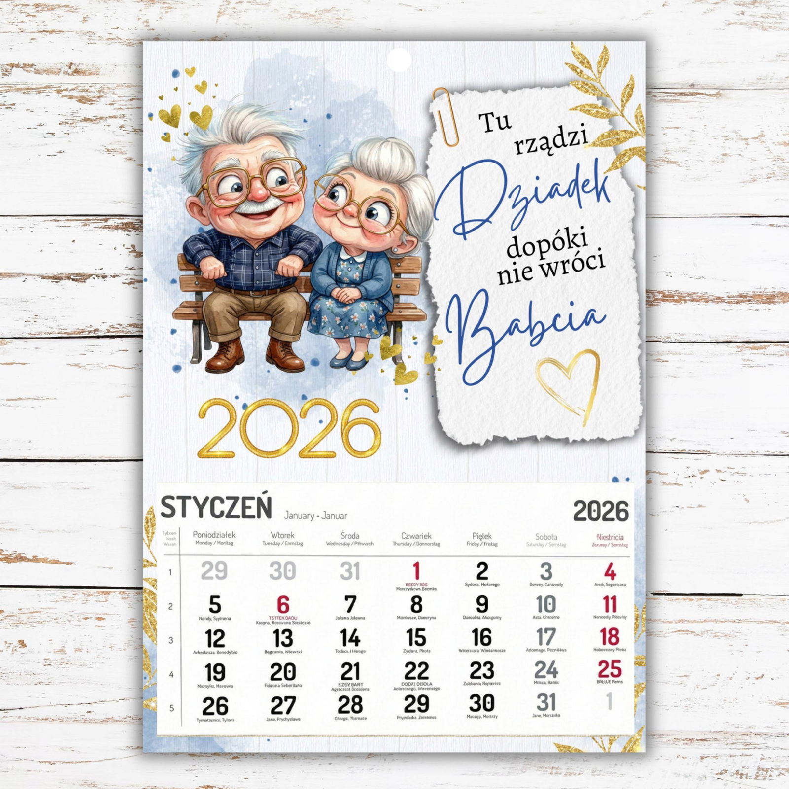 Przepiękna szata graficzna: Delikatne, akwarelowe kwiaty w odcieniach fioletu oraz ciepła ilustracja przytulonych dziadków dodają całości uroku i elegancji. � Duży i czytelny: Format A3 (ok. 30x42 cm) oraz wyraźne cyfry w kalendarium (z zaznaczonymi świętami i dniami wolnymi) są idealne dla seniorów. Gotowy prezent: Taki kalendarz to gotowy, efektowny upominek, który z dumą zawiśnie na ścianie w kuchni lub salonie Dziadków.