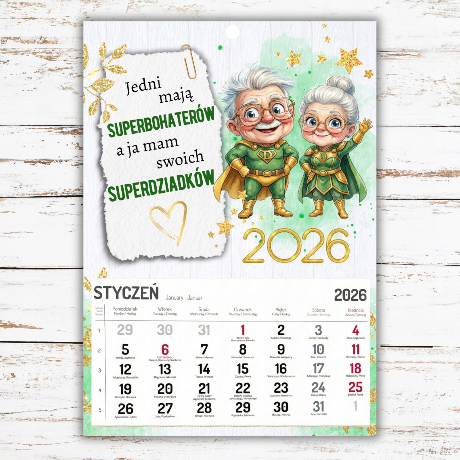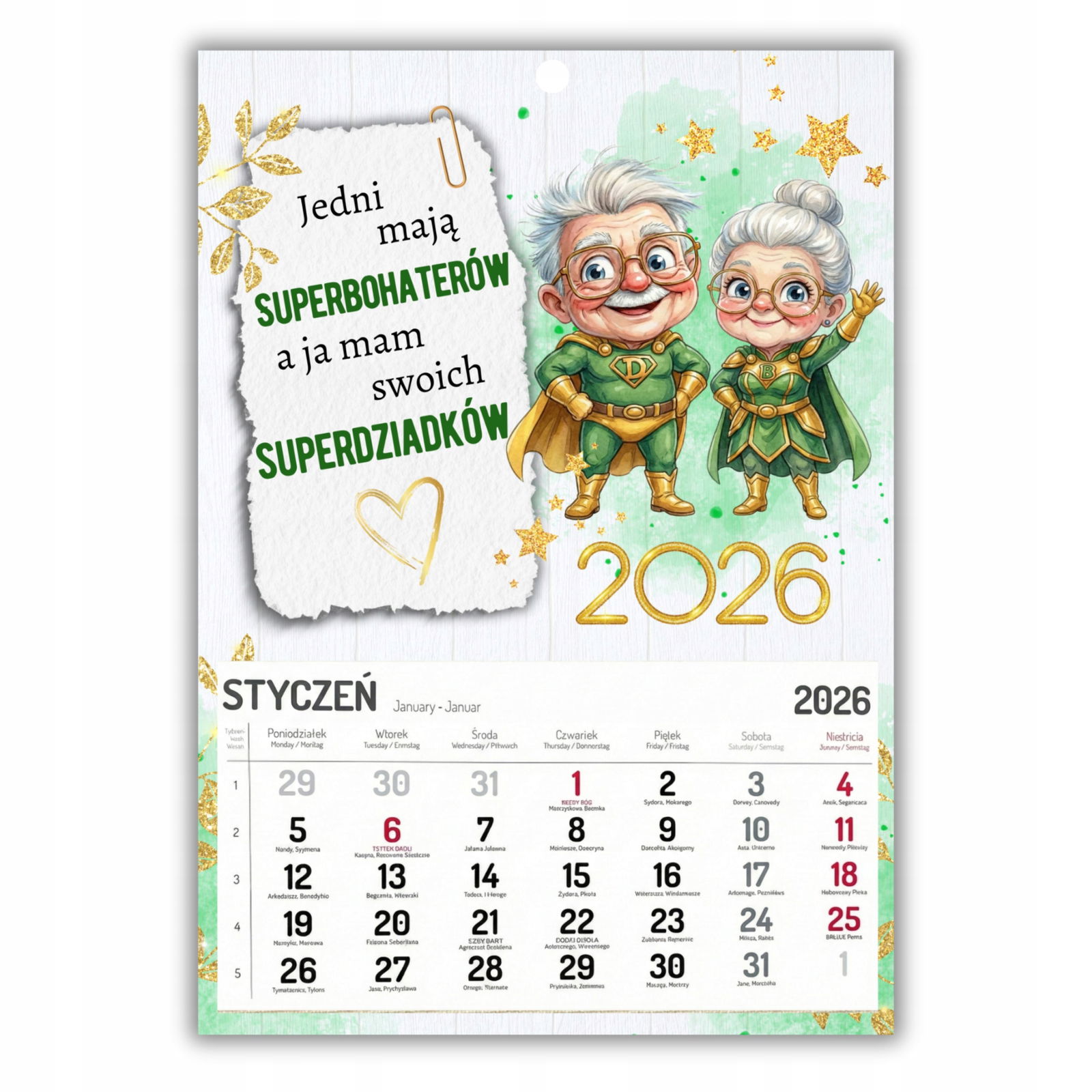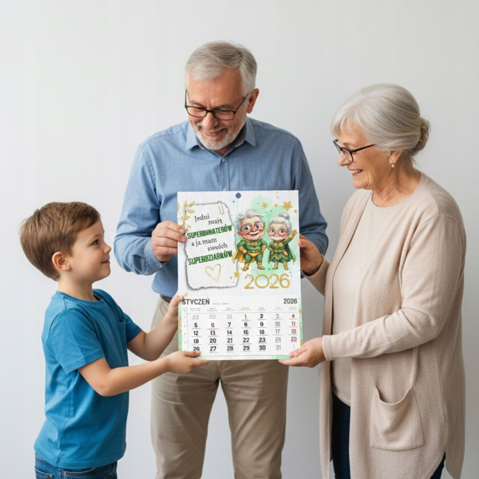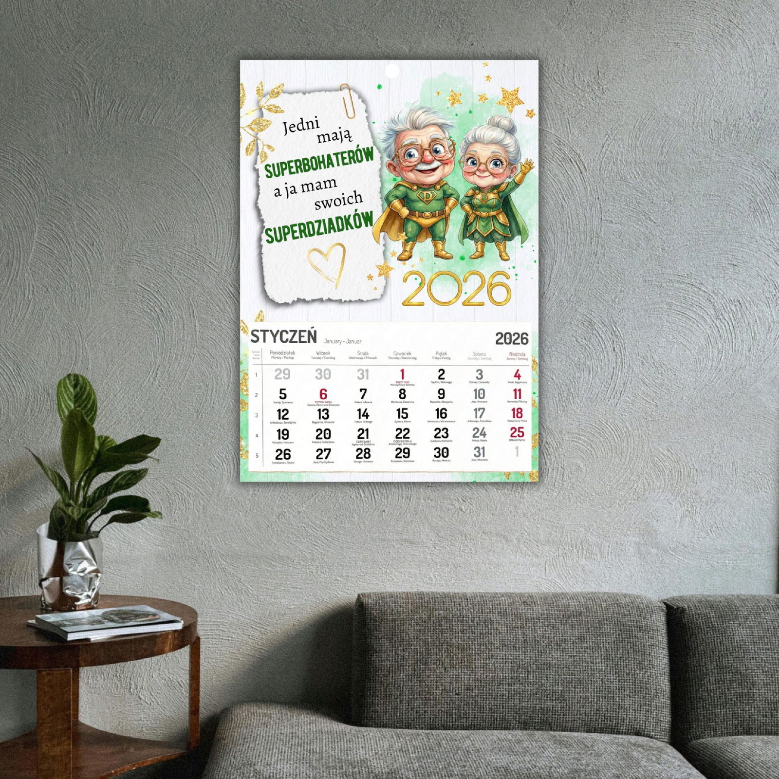 Nasz duży kalendarz w formacie A3 to idealny prezent z okazji Dnia Babci i Dziadka. Połączenie Waszego rodzinnego zdjęcia, uroczej grafiki i czytelnego kalendarium sprawia, że jest to upominek zarówno piękny, jak i praktyczny.