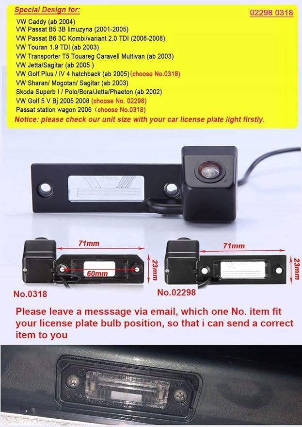 Kamera cofania ze wspomaganiem parkowania do V W Touran Passat Caddy Golf Plus Multivan T5 Transporter Superb (nr 02298 = kąt prosty)