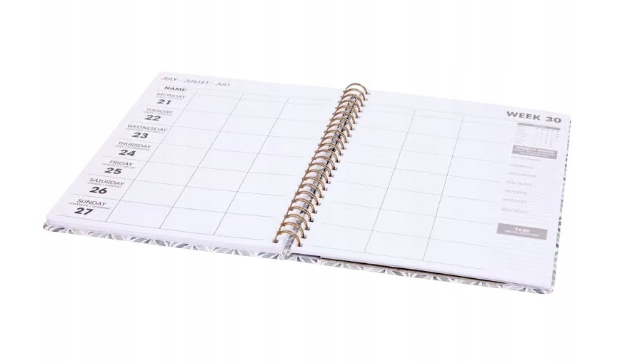 - Wnętrze: Układ tygodniowy, duże pola do notowania